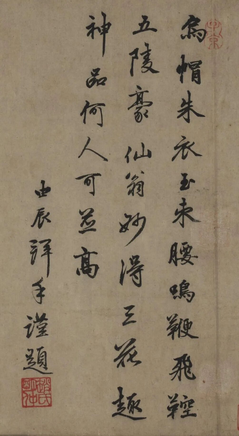 “乌帽朱衣玉束腰,鸣鞭飞鞚五陵豪。仙翁妙得三花趣,神品何人可并高。由辰拜手谨题。”