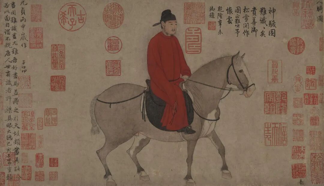 此图线描工整,细韧遒劲,设色浓丽,画面布局、人物马匹形象,都深得唐代韩幹画马之法。