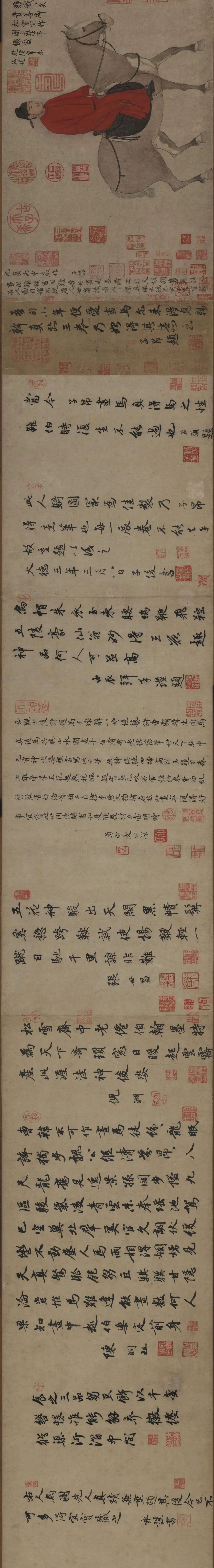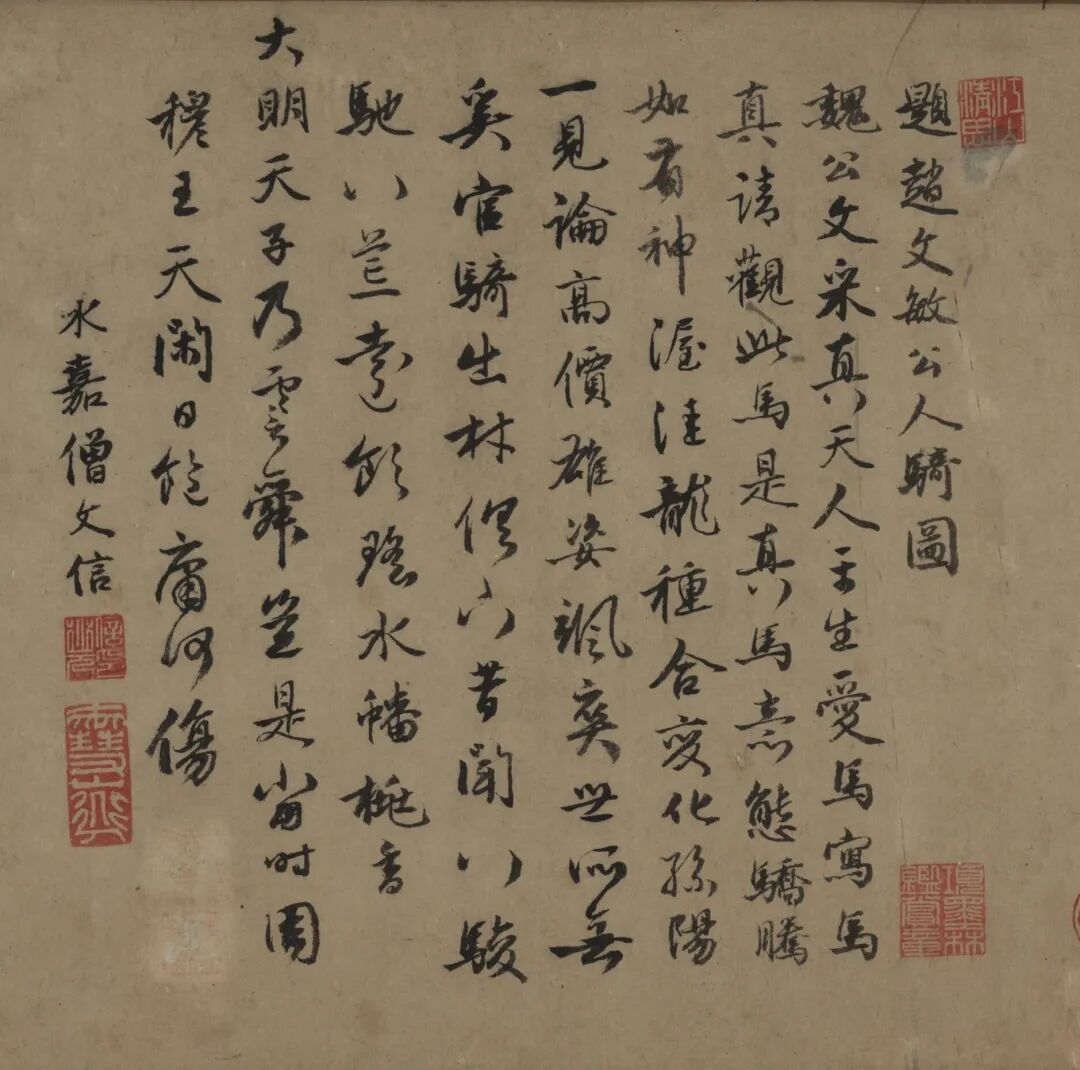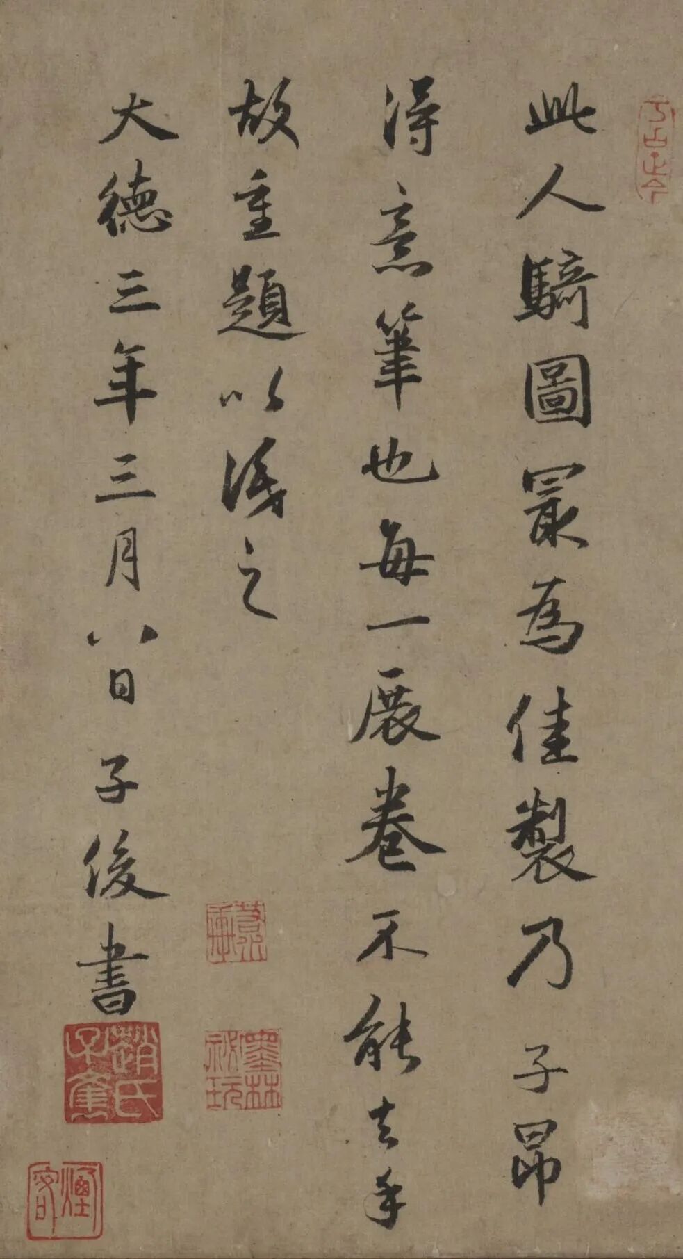 “此人骑图最为佳製,乃子昂得意笔也。每一展卷,不能去手……大德三年三月八日子俊书。”