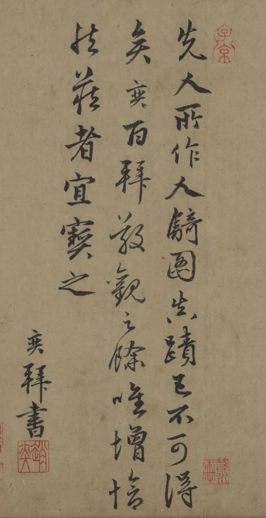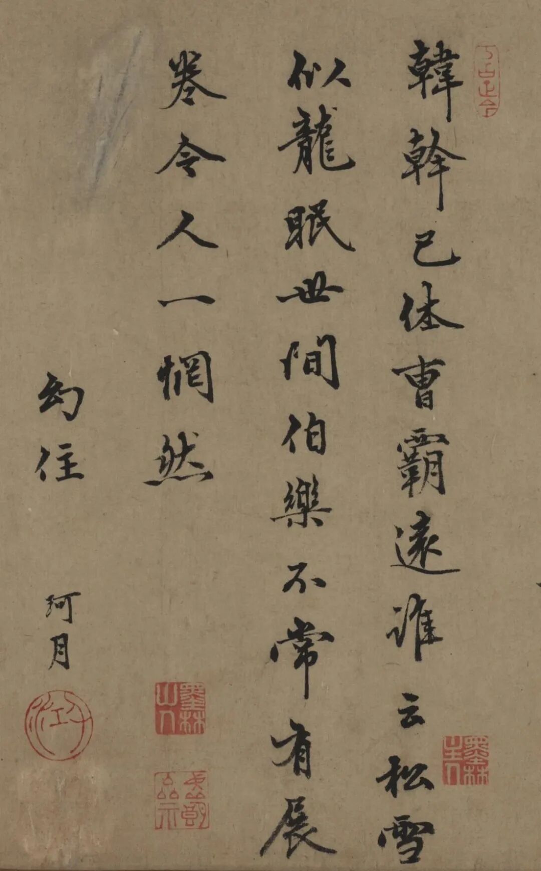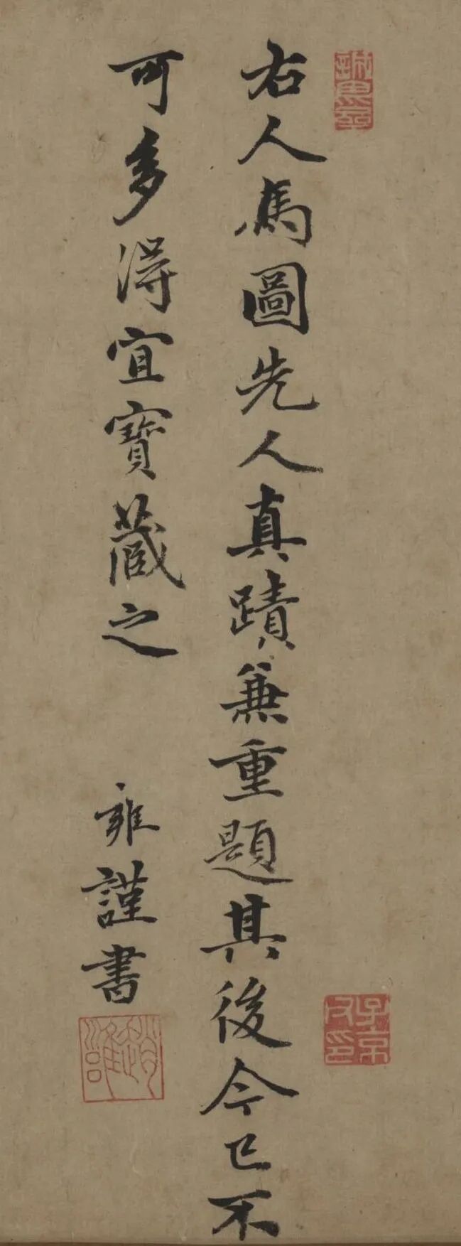 “右人马图,先人真迹,无重题其后,今已不可多得,宜宝藏之。雍谨书。”