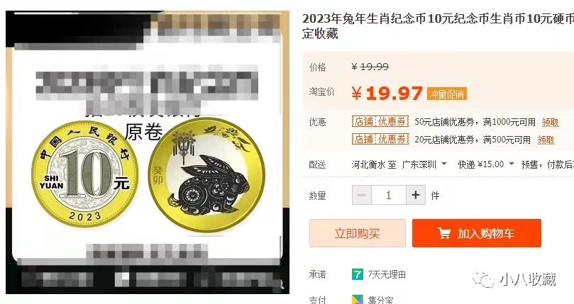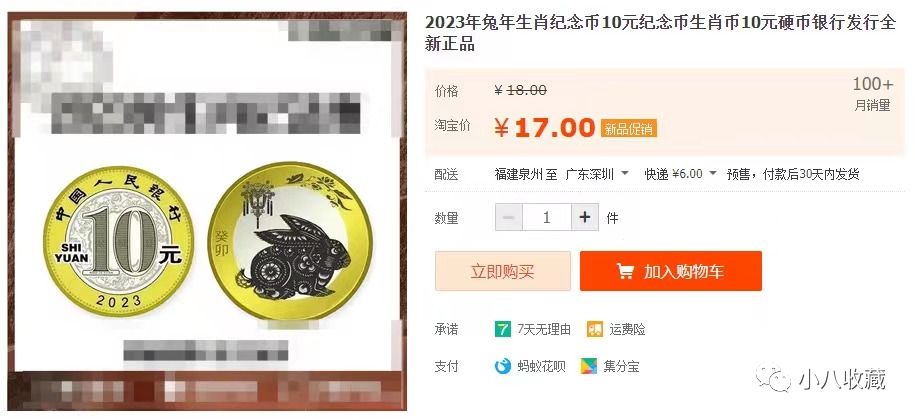 心心念念的2023兔年纪念币虽然还未发行,但是在某网上已经有商家开始出售期货,单枚价格在17元~20元不等,与10元面值相比,涨了近一倍!
