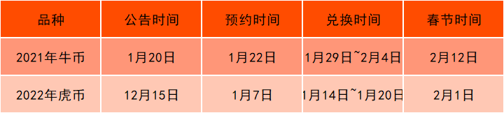 按照惯例,生肖纪念币基本都是在春节前预约兑换的,就拿最近两年发行的牛年币和虎年币来看,都是在春节前1个月左右公告。