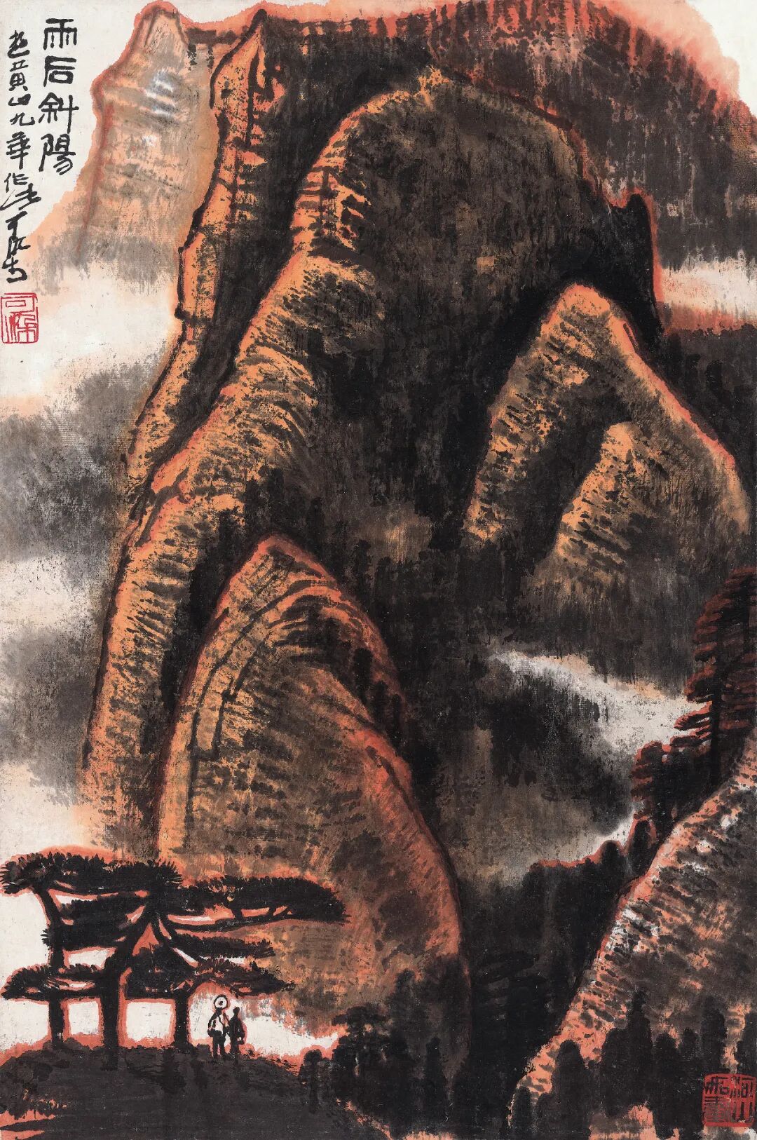 估价:RMB 2,000,000-3,000,000【注】此件作品的交接地点为中国香港,具体信息请联系北京保利拍卖中国书画部工作人员。黄山主题佳构辈出。本幅作品中,李可染将山水的物象取舍提炼,仅保留山峦、云雾、松树及游人,诸多琐碎细节亦被简化,通过凝聚的笔墨,将最具感染力的山间风光呈现于观者眼前。夕阳的光辉在雨后云散之时洒向巍峨重峦,景物犹如披上了金被;山间云烟流淌,雨后润泽的气息扑面而来。近处山石上,游人站立于松下,眺望着远方的美景。画面的位置经营颇具匠心,极具张力,主峰迎面高耸,不留天地,气势逼人,有北宋山水的气象;环绕于山间的烟云则营造出山峦的层次和空间距离。
