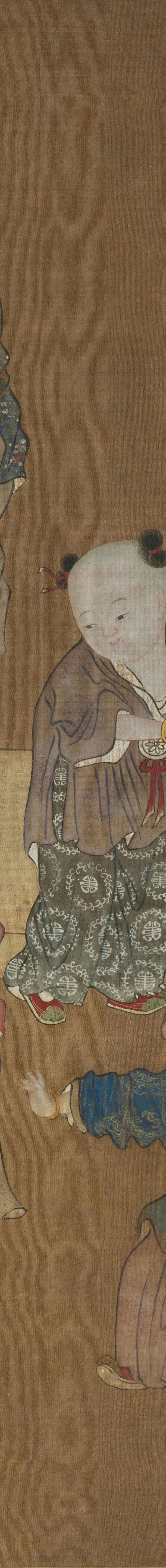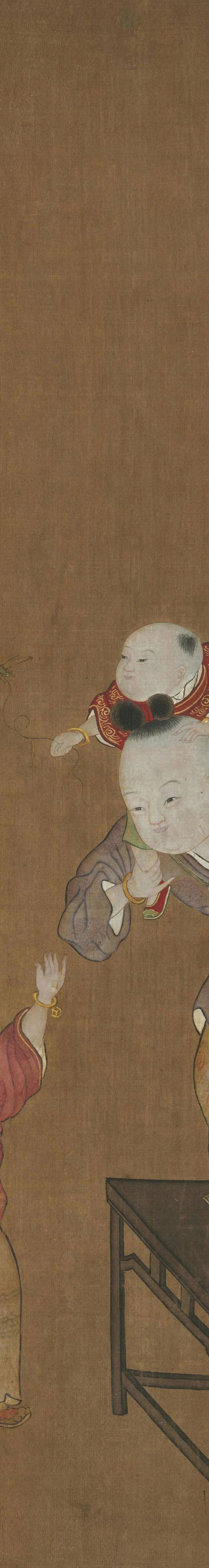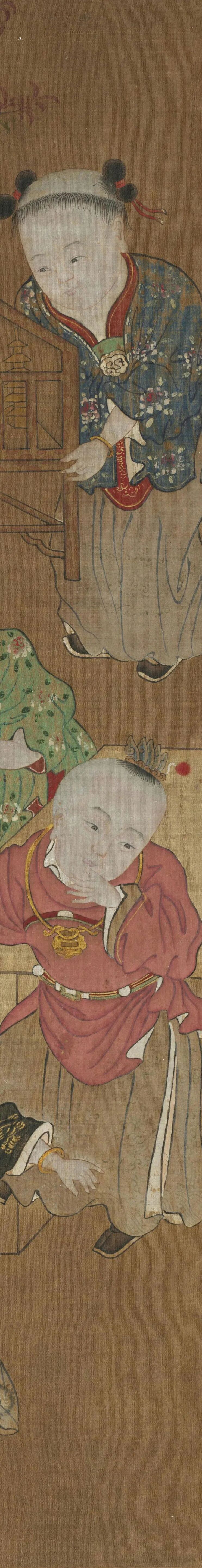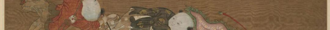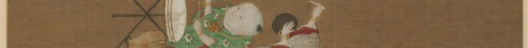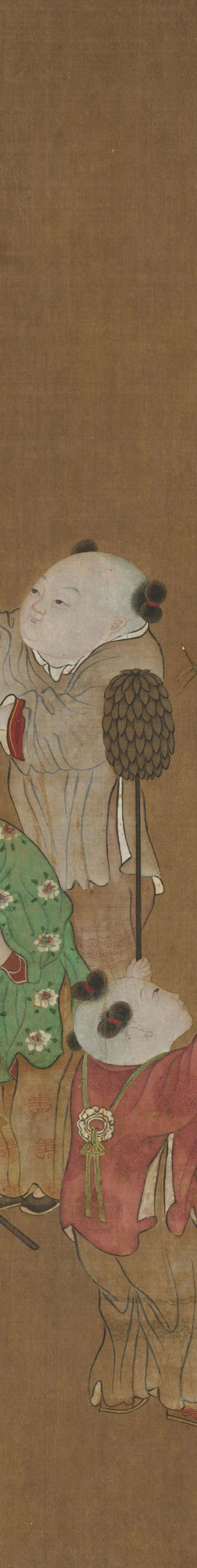这幅《婴戏图》作者为明代画家夏葵,内容上看画了魁星高照、五子登科、吉祥有余、五谷丰登等喜庆场面。《婴戏图》虽然有个“婴”字,但画面内容都是活泼健康的孩童,画中的胖娃娃一看就是富贵人家的孩子,一个个锦衣披彩,身着绫罗绸缎。由左向右欣赏,就仿佛是明代贵族幼儿园的户外活动写真。此卷现收藏于克利夫兰艺术博物馆。