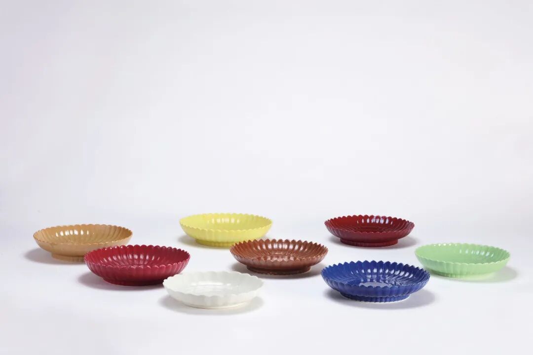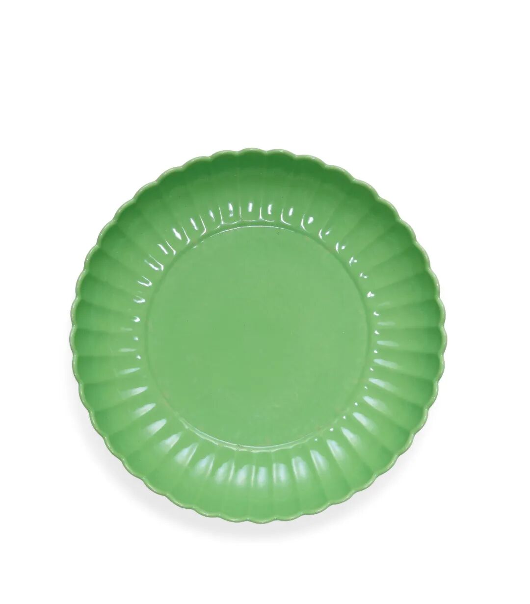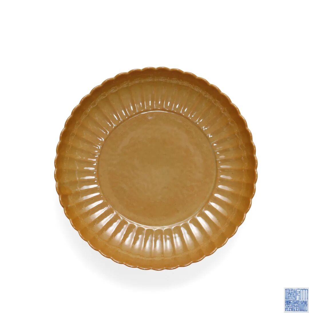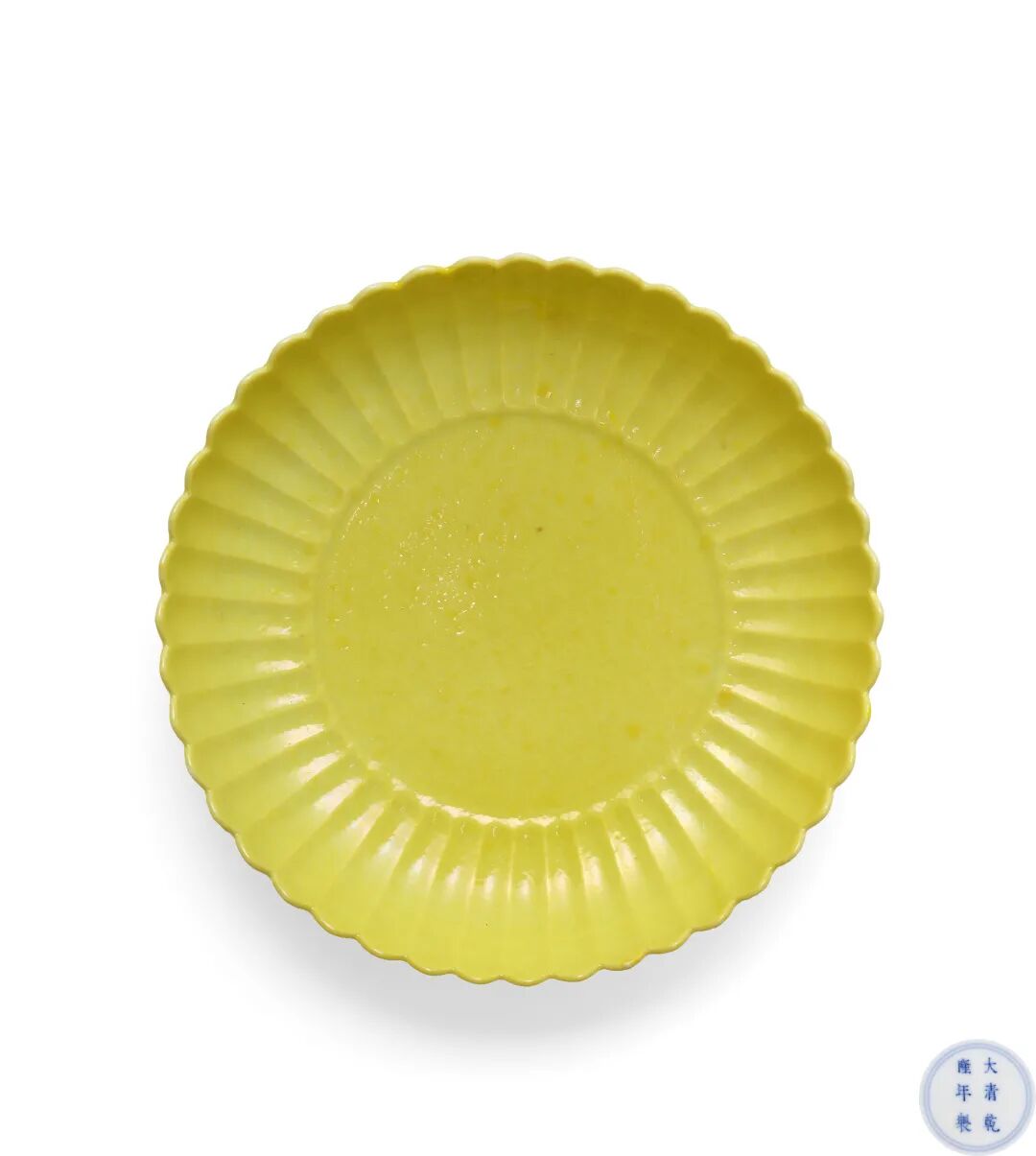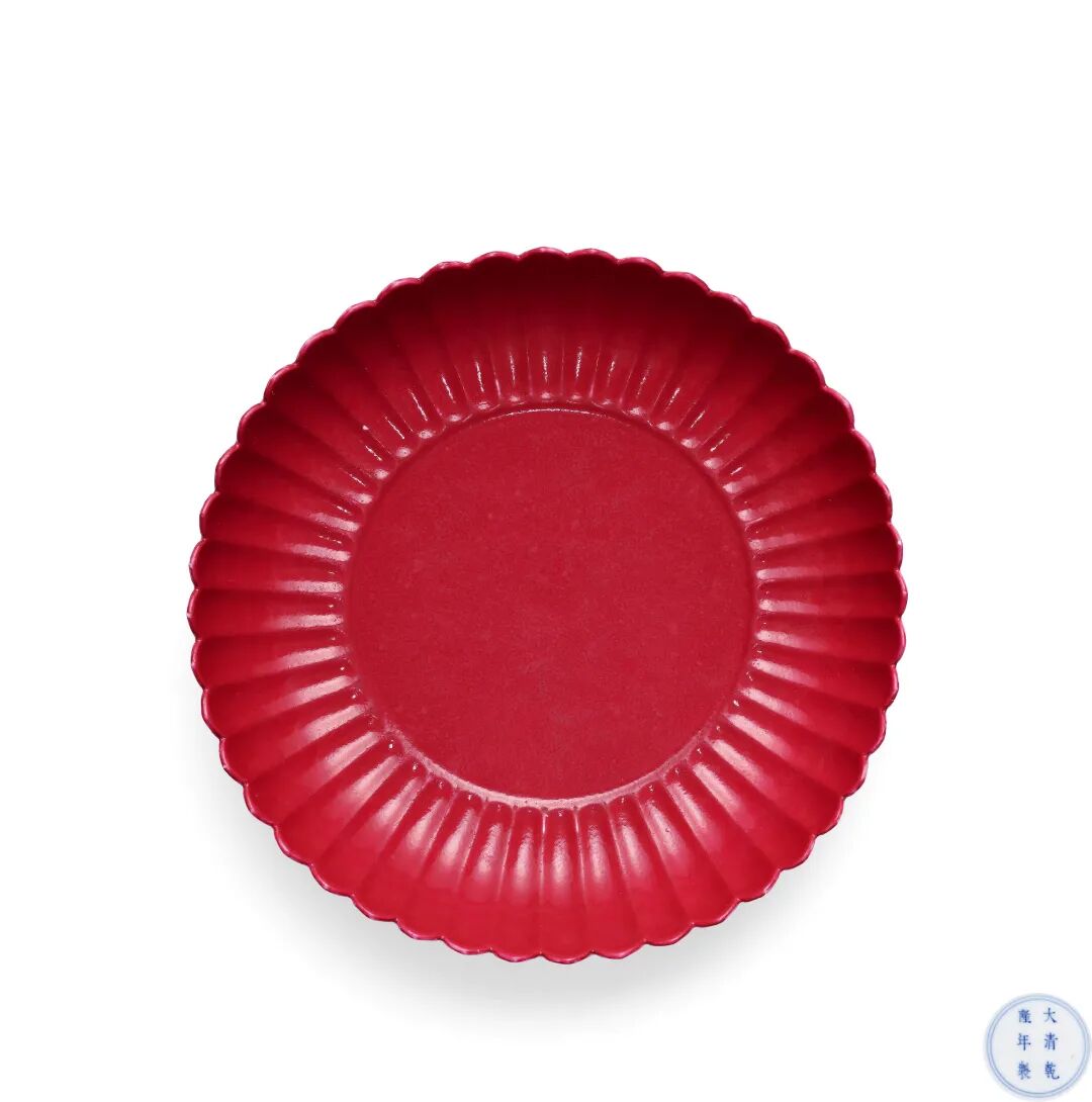 单色釉菊瓣盘为雍正官窑经典作之一,其设计精巧,线条俊秀优美,存世稀少,极为珍贵,历来受到中外大收藏家们的珍爱。北京故宫博物院现藏雍正十二色釉菊瓣盘一套,可作参考。乾隆御窑菊瓣较雍正窑更为圆润,与雍正御窑菊瓣盘之型略有化裁而来,亦具隽美高雅之态。