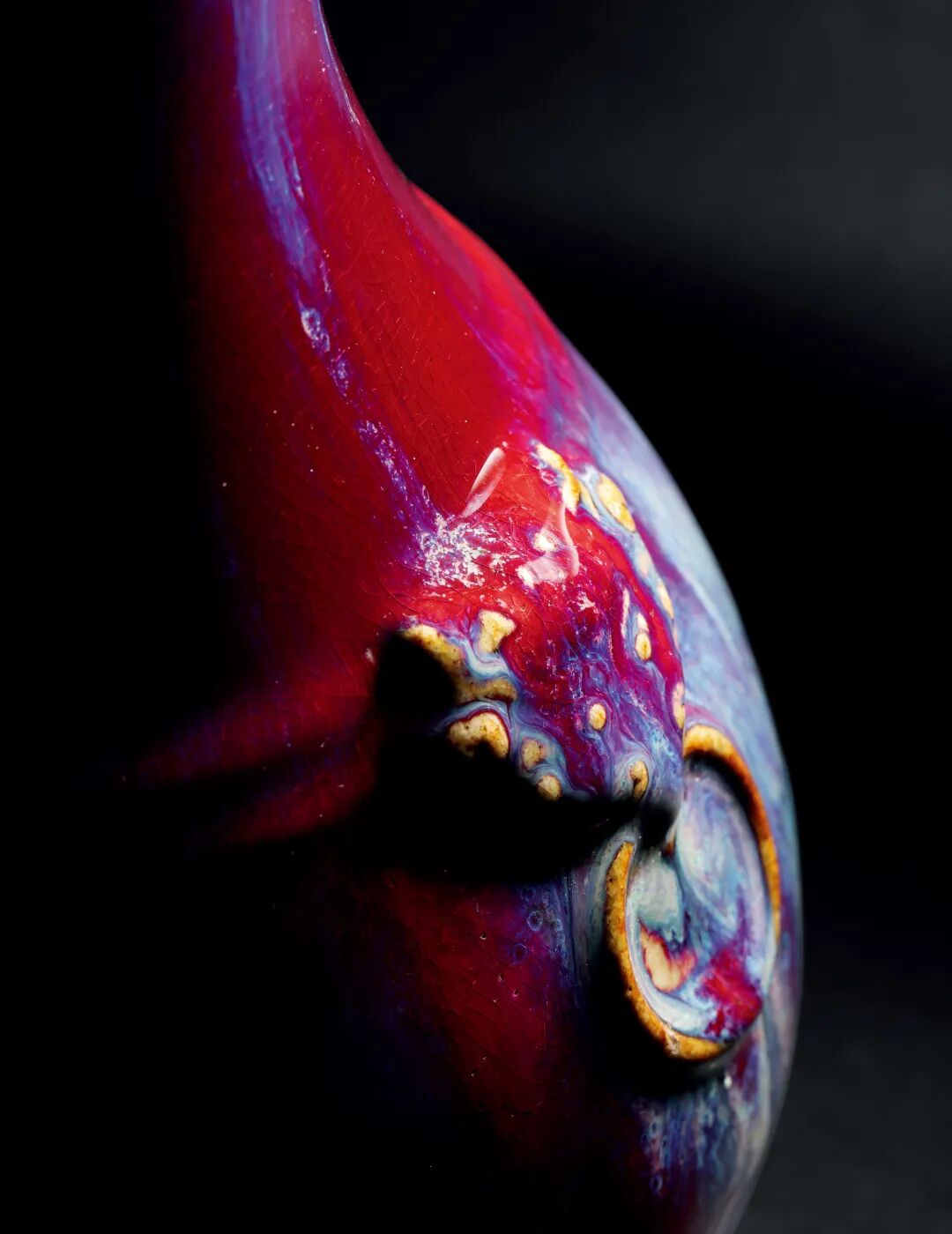 本品撇口,近口沿处及肩腹部饰双弦纹两组,肩两侧对饰铺首衔环,兽面的口中衔一环,称“铺首衔环”,由青铜器肩部装饰的衔耳环兽首演化而来。通体满施窑变釉,釉色斑斓绝美,密布开片,色泽中紫红色较重,参杂天蓝、月白两色流淌交融,有“云乱水光浮紫翠”的诗意之美。