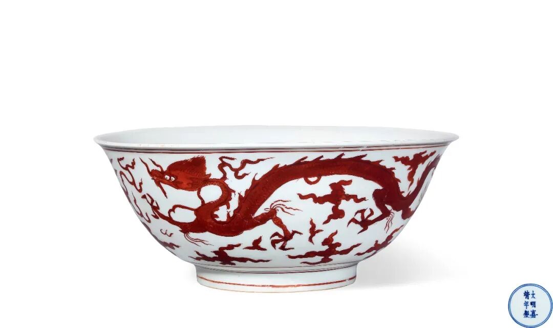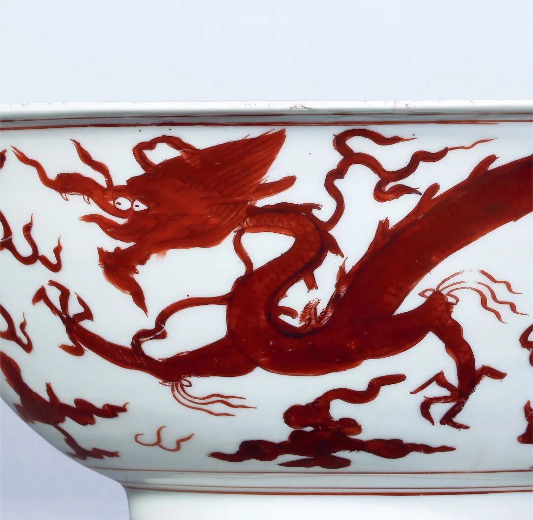 此种釉里红制法承袭自永宣御窑,所得红色更显强烈,虽无法呈递纹样细节,具有天然红宝石般光泽,最适凸显剪影视效,文献称之为“釉里红宝烧”,为雍正御瓷中仿古佳制,彰显其品味之逸雅绝尘。