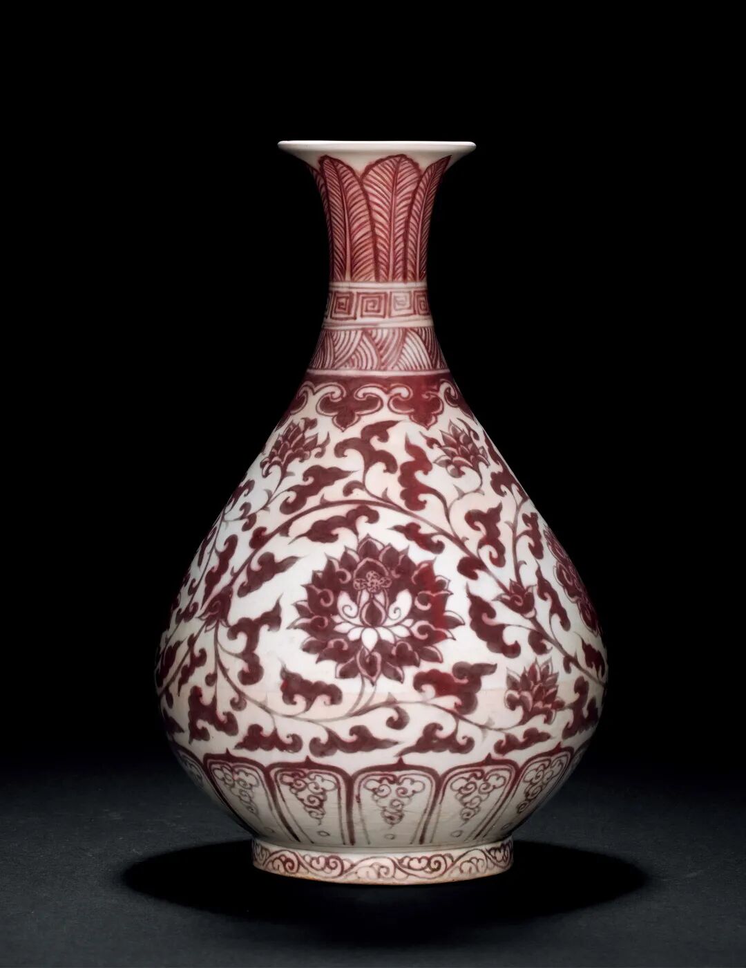 本品以釉里红为饰,发色堪称完美,纹样满布,分层而饰,繁而不乱。腹部主体纹样为缠枝西番莲纹,莲枝饱满硕大,仰俯有致,风姿典雅。整器布局繁密,层次丰富,笔意酣畅洒脱,枝蔓的运笔尤显婉转自若。
