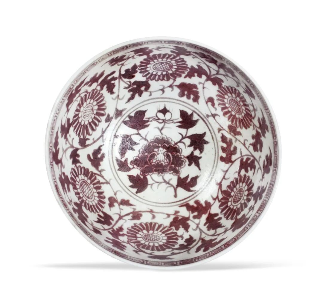 本品造型沉稳,胎体厚重,器形敦厚典雅,通体内外均以釉里红装饰。内壁绘六朵缠枝菊花,叶片细长,尤其缠枝画法,画笔流畅,干脆爽利,颇有中国画的写意气韵。菊花纹是洪武一朝的流行装饰纹样,多呈椭圆状,故又被称为“扁菊花”,其细长的的叶片、网格状的花蕊,均具有鲜明的时代特征。此碗釉里红发色纯正,可谓洪武釉里红瓷器中的代表作品。