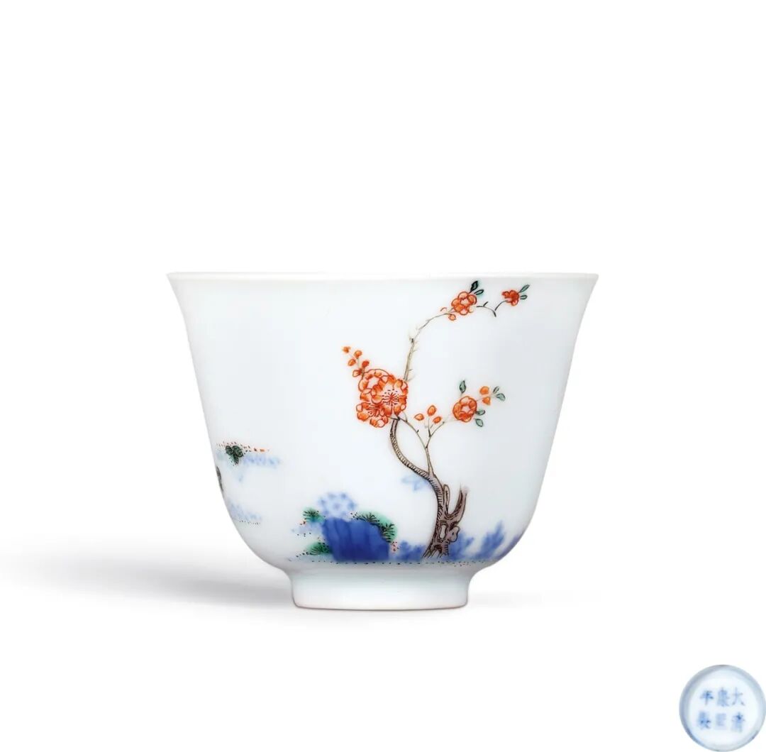 花神杯用唐诗为花做注,皆因康熙帝喜唐诗之故。本拍品杯形小巧,胎薄体轻,釉面温润,内外施白釉,外壁以五彩绘二月杏花花卉图,另一面配以题诗:“清香和宿雨,佳色出晴烟”,诗文结尾处钤印“赏”字印章款。