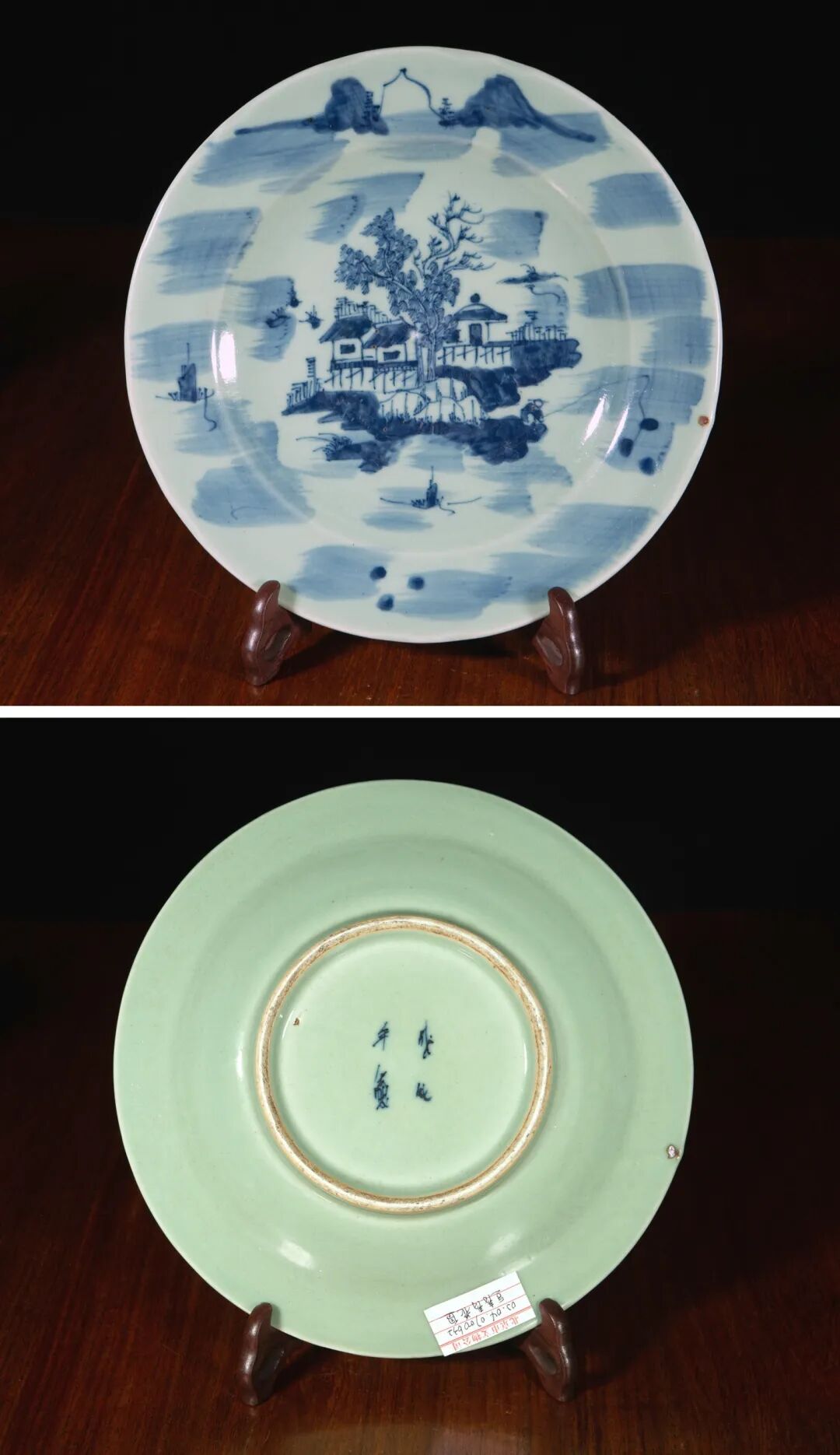清乾隆 豆青青花山水大盘