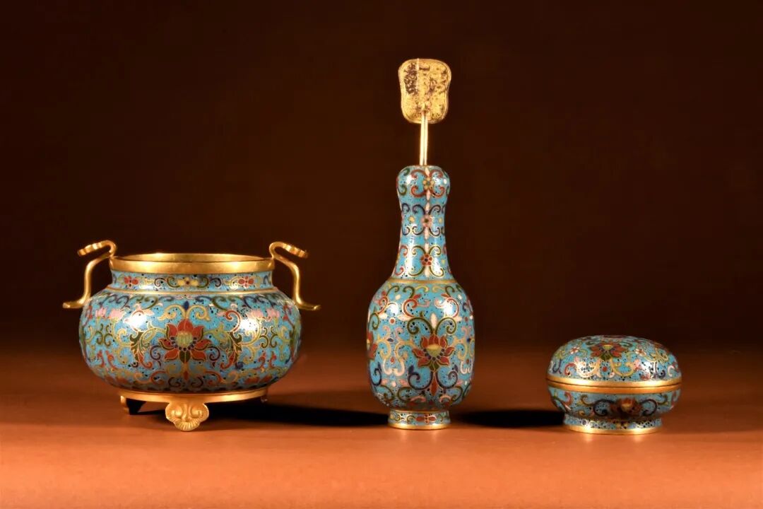 清 铜胎掐丝珐琅缠枝莲纹炉瓶盒三事