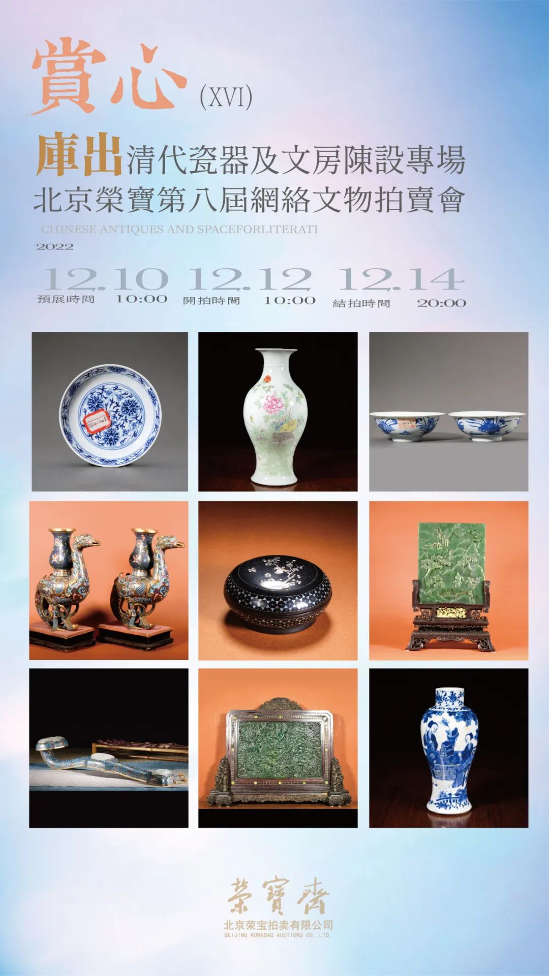 北京荣宝第八届网络文物拍卖会——赏心(XVI)·库出清代瓷器及文房陈设专场将于12月10日10:00—12月12日10:00开启线上预展,并于12月12日10:00开拍,12月14日20:00结拍。