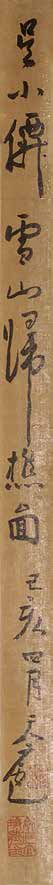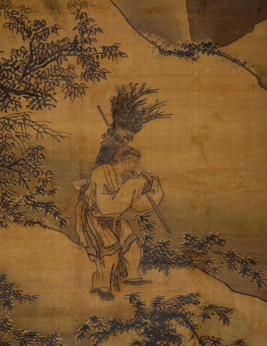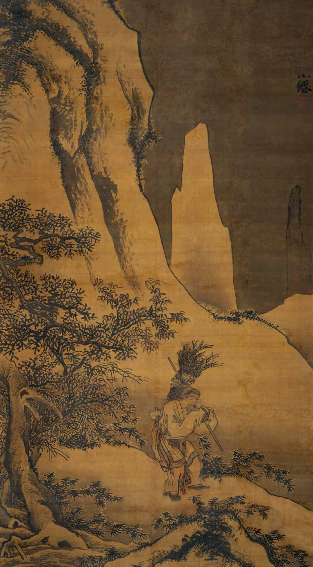 依据存世吴伟画作而观,其风格有三,其一是严谨、细致、刻画精微的的人物画,如上海博物馆藏《铁笛仙图卷》、广东省博物馆藏《洗兵图卷》、故宫博物院藏《武陵春图卷》以及《问津图卷》等;其二是大幅的放逸狂纵风格的山水画,如故宫博物院藏《长江万里图卷》、《渔乐图轴》、《灞桥风雪图轴》,安徽省博物馆藏《踏雪寻梅图轴》;其三是放笔写山水林木、细笔刻画人物的故事画,如沈阳故宫博物院藏《问道图轴》、上海博物馆藏《临流读书图轴》、青岛市博物馆藏《松下读书图轴》,本幅《寒山樵夫》也属于此类作品,这类作品完全能看出吴小仙似醉实醒,粗豪中见精致的一面。本作大幅绢本,行笔粗细兼备,樵夫于寒山中负柴捆雪中踽踽独行,步履蹒跚,似有不堪负重,其辛勤之态极为传神;衣纹刻画则挺健豪放,水墨酣畅,而雪山及雪柏、翠竹的精细刻画又将画家高超的绘画水准表现的一览无余。吴小仙作画落款以姓名款为多,少见长篇题跋文字,“小仙”二字也保持了宋代画家的古风。