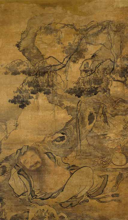 明朝画家中最喜欢饮酒的莫过于“画状元”吴伟。“江夏派”鼻祖的父亲吴刚是一位举人,兼职画家,其去世时,吴伟还只是个幼童。吴伟很小就被知府钱昕收养。钱昕将吴伟送到家乡海虞,做其子的伴读在私塾上学,这可能是吴伟所接受的仅有的正规教育。后来知府发现了吴伟的绘画才华,便开始为这个初露头角的年轻艺术家提供便利。在北京,成化皇帝通过成国公朱仪、太傅王恕、太保平江伯陈锐、将军张懋、保国公朱永、驸马周德章的举荐很快知道了吴伟的大名并且在紫禁城召见了他,欣赏完年轻画家的现场挥毫后,皇帝赐与吴伟锦衣卫镇抚的职位,接着,仁智殿、文华殿便成为吴伟在皇帝面前展示其绘画才艺的场所。明朝的史书典籍中有关吴伟嗜洒的记载,笔记小说中有关吴伟醉酒的故事比比皆是。《江宁府志》说:“伟好剧饮,或经旬不饭,在南都,诸豪客时召会伟酣饮。”詹景凤《詹氏小辩》说他“为人负气傲兀嗜酒”。周晖《金陵琐事》记载吴伟酒醉用莲蓬画蟹,赢得在场人们的齐声喝采。姜绍书《无声诗史》记述吴伟待诏仁智殿时,经常喝得烂醉如泥。一次,成化皇帝召他去画画,吴伟已经喝醉了,命他作松风图。他踉踉跄跄碰翻了墨汁,信手就在纸上涂抹起来,片刻,就画完了一幅笔简意赅,水墨淋漓的《松风图》,在场的人们都看呆了,皇帝也夸他真仙人之笔也。自此“吴小仙”的名号确立起来。