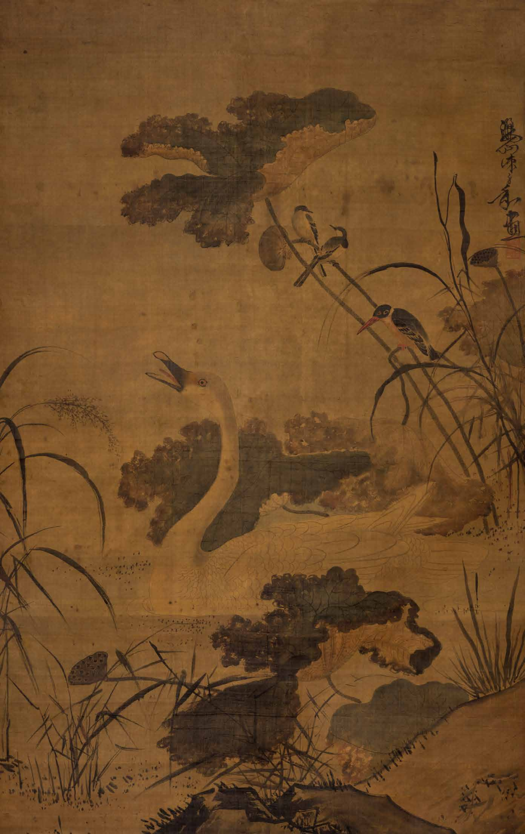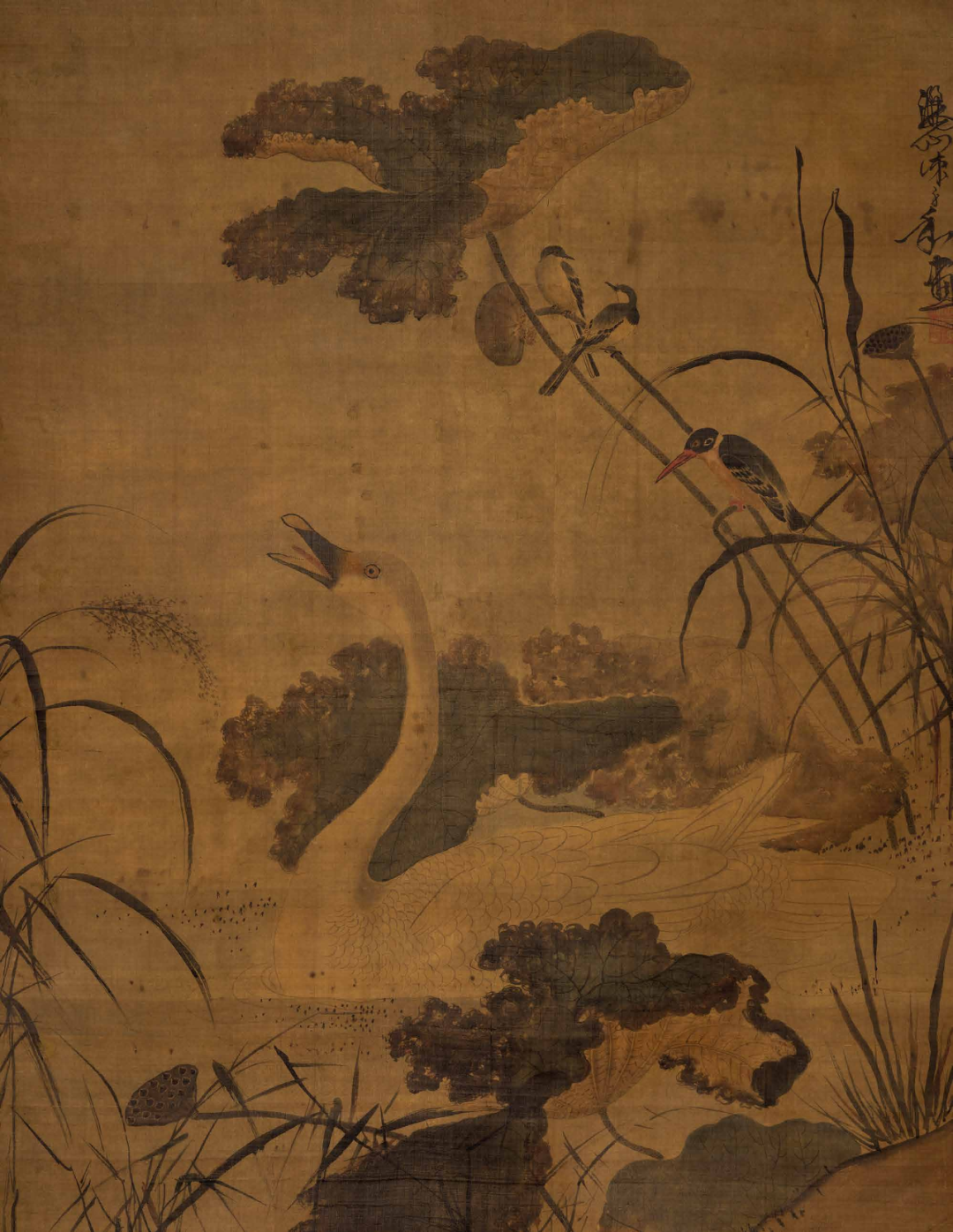明代浙派绘画在传统的绘画史上有着重要的地位,其大胆突破宋元以来正统绘画用笔用墨的藩篱,释放了笔墨中蕴含的巨大能量,开启了晚明大写意绘画的先声。雄快俊发是浙派绘画的主要特色,此幅《荷塘聚禽》图足以当之。