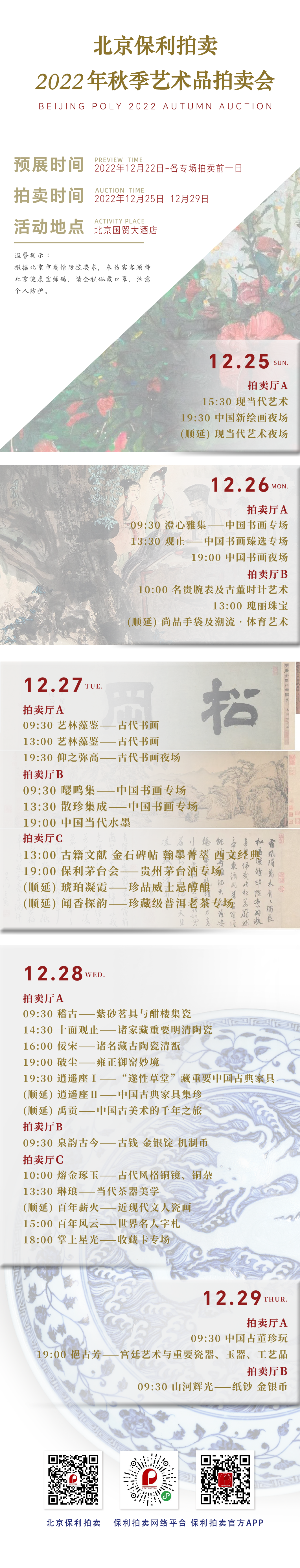 北京保利拍卖2022秋季艺术品拍卖会将于2022年12月22日在北京国贸大酒店拉开序幕。12月22日至各专场拍卖前一日为预展时间,12月25日至29日各专场相继举槌。