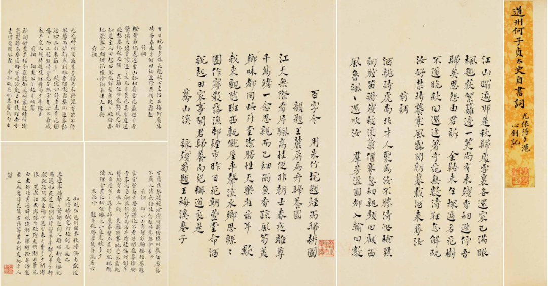题识:《百字令用朱竹坨题烟雨归舟图韵题王麓屏扁舟归养图》《蓦山溪咏残菊题王梅溪卷子》《前调》《前调》《前调》《前调词画不了故有此篇》《前调诗小山写残菊鞠矮幅属题》《水龙吟题吕秋塍学使旧藏唐六如秋江送别图卷秋塍济南试竣又将按试兖沂故词尾及之》《江水令孙纪堂同年以一骡交桂儿带往都门赠友,骡行未十里窜回旧寓,纪堂令仆人强曵行而去余闻之曰此义骡也,漫填一阕》《金缕曲初习倚声因病即歇,仲衡制金缕曲桃我,即次韵之复制此奉柬春源左袒二字,偶然索笔,勿罪勿罪。苏常殊调则夙闻之,潘季玉张仲远希明示我》《前调仲衡谱金缕曲见慰劝令填词遣闷,余近日甫与仲衡春园讲肆未得门径也,辄用前调次韵奉报》《朝玉阶李仲衡除日纳姬索诗迫无以应为填小词》《酷相思四月廿七日夜雷雨,次日晨起柬诗歌舲少宰》《满江红诗舲翦牡丹见贻》《水龙吟 对雨柬沈郎亭少农淀园》(文不录)五月七日书付三弟,蝯。说明:前有另纸二,一贴“光绪甲午春仲左宗棠题”小条,二钤“何绍基印、子贞”二印。"说明:龚照瑗、龚心钊旧藏。龚照瑗(1836-1897),字仰蘧,号卫卿,安徽合肥人,出身簪缨传世、声名煊赫的名门望族。同光年间,龚照瑗历任山东登莱青道、江苏苏松太道、浙江按察使、四川布政使、光禄寺卿、太常寺卿、宗人府府丞等高官要职,期间曾办理机器局、制造局、电报局、火药局与铁路、电线、军需、转运等洋务事宜,并于甲午前后派充清驻英、法、意、比国公使。龚照瑗一生跌宕起伏,毁誉参半,颇具争议。龚心钊(1870-1949),字怀希,号仲勉,安徽合肥人,寓居上海,是清末著名的外交家、收藏家。钤印:何绍基印、子贞。鉴藏印:龚生审定真迹、仰蘧所藏此册是何绍基抄录自作词十五首,未署年款,俱为小楷誊写,一丝不苟,极为精秀雅致。查钱松《何绍基年谱长编》,有“此年(1856)冬填词多首,并与嵇春源、李仲蘅等人讲求词律。如《贺新凉》云:旅居寂寂,忽想填词,嵇春园山长见示万红友《词律》,阅其凡例,知与我同一门外也,漫填二阕请教。其《金缕曲》亦云:仲衡谱《金缕曲》见慰,劝令填词遣闷,余近日甫与仲衡、春园讲肄,未得门径也,辄用前调次韵奉报。与善化人余棨(芰香)多有往来。余氏多次馈筍,并送牡丹。”又“此月(1857年五月),曾寄济南家书。案:此信札原无标题,《何绍基黑迹》署为《致何庆涵家训》,今年何庆涵同行至京师,故《顾先生祠会祭题名弟一卷子》于今年顾亭林生日祭及秋祭中均有提及,《何绍基墨迹》之标题有误”。《自作词册》均抄录了以上诸词,多刊于《东洲草堂诗钞东洲草堂诗馀东洲草堂文钞》,清同治六年(1867)长沙无园刻本。且册后有“五月七日书于三弟”的记录,故将此册创作年代定于填词时间(1856年冬)之后,寄济南家书同时,即1857年五月较为合理,而《何绍基黑迹》署为《致何庆涵家训》信札,标题当为《致何绍祺函》。何绍祺(1801-1868),字子敬,号勗潜,何绍基三弟,道光十四年(1834)举人,官至浙江道员。后人评价子敬“书法平原(颜真卿),能承家学”。中国古董珍玩本季依旧延续往季传统——整体阵容强大的同时,各板块均异彩纷呈。领衔整季的重器当属禹贡夜场之欧洲秘藏近百年的永乐御窑神品,明永乐青花留白锥刻海涛龙纹大盘。除伊朗国家博物馆藏两例,上海博物馆藏一例宣德年款者外,永乐青花白龙盘,完整器仅此一例,可见其存世之罕,艺术性与学术性均极为重要。同场亦有明成化斗彩夔龙瓜瓞纹天字罐,此类底书“天”字之成化罐,清代已有“天字罐”之称,乃成化斗彩名品,源出明成化帝极高的品位与对器物品质的极致要求,素以传世量极稀闻名,本器所属斗彩瓜藤龙纹品种更是仅有三例传世,为市场上难得一见的妙品。瓷器部分另有清乾隆洋彩群仙贺寿如意云口尊、清乾隆茶叶末釉加洋彩披肩花卉太平有象双象耳尊等数件明清宫廷御制瓷器精品呈现。御制珍玩部分同样精彩迭现。此次秋拍特别推出逍遥座II——“遂性草堂”藏重要中国古典家具,呈现“遂性草堂”主人倾二十年之力所藏珍品22件(组),为经典的明式黄花梨家具系统性收藏之典范,秘藏甚久,首度为公众乃至同好所知,以其中明末清初黄花梨独板面大架几案最为震撼。此件为原装案面架几案,尺寸巨大,达到354公分长,兼得用材、工艺、造型、比例、皮壳之美者,市场所见几乎无出其右。禹贡夜场御制珍玩部分亦有一件清康熙御制紫檀百衲面螭龙纹大供案,同为市场上难得一见的紫檀重器。此画案长252.8厘米、宽107.9厘米、高90厘米,是目前国内外曝光资料中最大的一件,工艺上为百衲包镶,及九道披麻挂灰,可见其品级之高,或可改写国内外对中国紫檀家具的传统认知。清康熙御制铜鎏金说法印燃灯佛坐像为清代康熙早期典型的宫廷御制造像,其气质中正慈祥,延续了明代永宣宫廷造像的遗风,同时纹饰华丽繁复,亦凸显了康熙早期雄强繁盛的社会状态所带来的美学风貌,体量硕大达44.5公分高,金水澄黄明亮,应为北京宫廷、行宫或皇家寺庙等重要佛堂所供奉的精铸造像,殊胜难得。清乾隆田黄苍龙教子钮“几暇鉴赏之玺”方印,田黄质地,随形雕双龙戏珠云龙纹钮,印文为阳文“几暇鉴赏之玺”六字,于《乾隆宝薮》、《嘉庆宝薮》和《道光宝薮》中均有明确著录,在清宫所藏的晋王羲之快雪时晴帖、宋苏轼渡海帖、元盛懋江枫