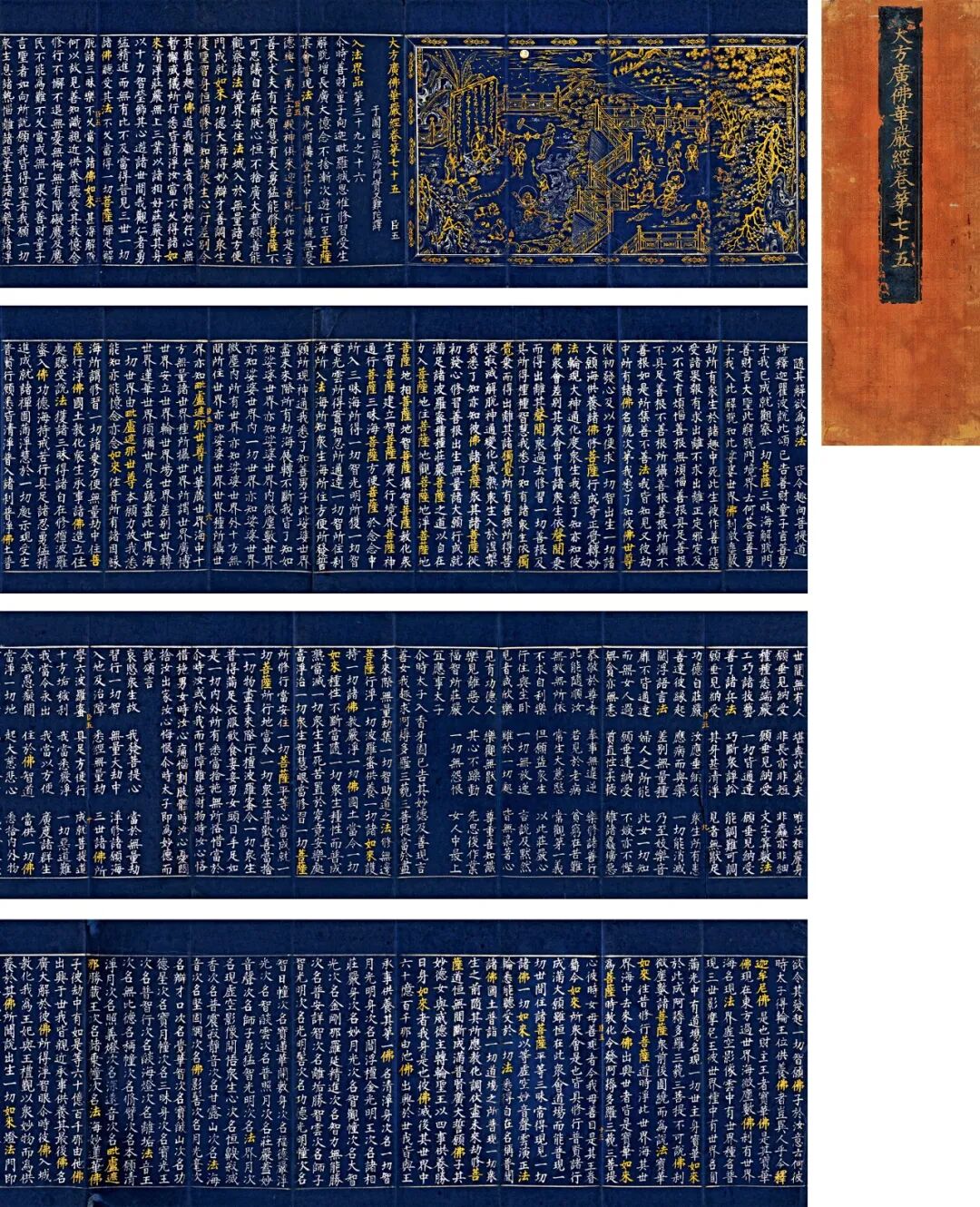 3、“李惠月写经”为存世孤本,仅有零卷传存,也是元代最早的金银字写经,故皆为藏家珍重。此卷为卷第七十五,日本京都国立博物馆存七十一至七十三以及普严行愿品,著名汉学家神田喜一郎曾专门撰文,此件与其相邻,可补公藏之缺。