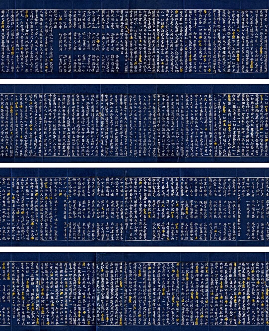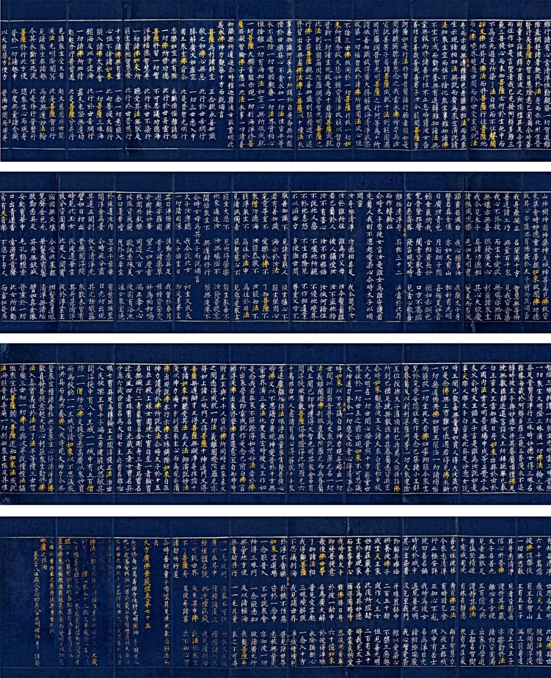 所谓金银字写经,是指以金泥或银泥来书写的佛经,大体分为金字经、银字经、金银字交书经(隔行)以及金银字混书经(银字书经,遇“佛”“菩萨”等字金书)。与敦煌保存的墨书写经相比,这种金银字经反倒极为稀少。