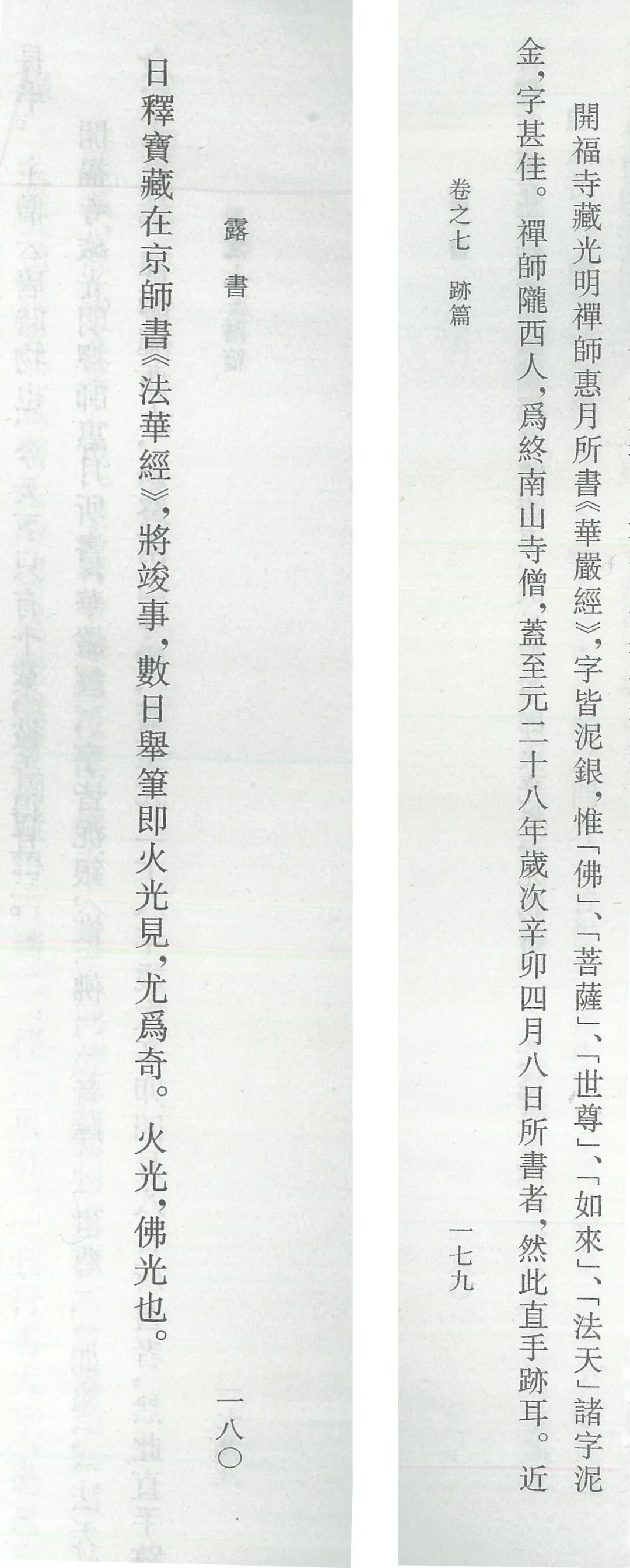 李惠月写经在明代留下一则珍贵的流传记录,姚旅(?—1622年)《露书》卷七载:“开福寺藏光明禅师惠月所书《华严经》,字皆泥银,惟‘佛’、‘菩萨’、‘世尊’、‘如来’、‘法天’诸字泥金,字甚佳。禅师陇西人,为终南山寺僧,盖至元二十八年岁次辛卯四月八日所书者,然此直手迹耳。”开福寺亦在西安,则明代时惠月写经早已流出写经题识里提到的万寿禅寺。综观此经,结字总体呈现长方形,笔画瘦硬,有欧楷特点。但具体笔画如钩和竖又有颜真卿的笔法。姚旅博学多闻,他亲见此经,称此经“字甚佳”,这是古人对本经书法上的评价,值得重视。