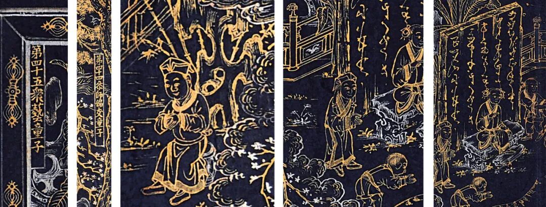 值得注意的是,此次新出卷七十五的扉画颇有特色,其左侧榜题“第四十四参遍友童子”,右侧榜题“第四十五众艺童子”。其中的图像颇有趣味。如衣冠方面,遍友童子所戴为“东坡冠”,显然继承的是北宋绘画的图样,在宋拓本《善财参问变相经》中,即有多处人物戴有此帽。又如在参遍友童子图像中,有儿童放风筝的构图;在众艺童子图像中,有儿童戏鸟的图像。这些多属于婴戏图的题材,在佛教绘画中颇为罕见。此外我们看到,在众艺童子背后石屏上书有一些符号,实际上就是经文里提到的众艺童子所说的四十二字母,这在同类的五十三参图中也不常见。可见沈氏父子所绘《华严经》,在紧扣经意同时,又使扉画呈现出不同的内容和面貌。从这种意义上来说,这是他们的创造,具有了文人画与经意画融合的倾向。北宋潘兴嗣在评论忠禅师的五十三参画作时说他是“游戏神通,幻出诸相”(《善财参问变相经》),我认为移用作沈氏父子华严绘画的评语也是合适的。