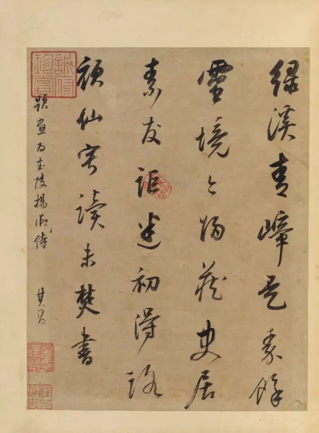 ▲(九)对题:两岸绿芜齐似剪,掩映灵山相向晚。船头独立望长空,日滟波光逼人眼。其昌。