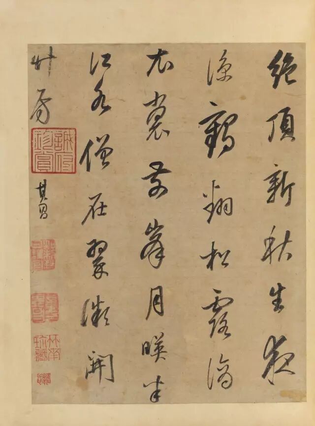 ▲ (六)无款。对题:绝顶新秋生夜凉,鹤翻松露滴衣裳。前峰月映半江水,僧在翠微开竹房。其昌。