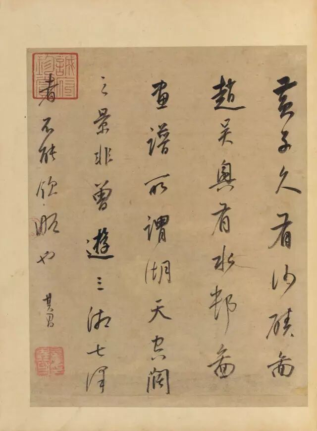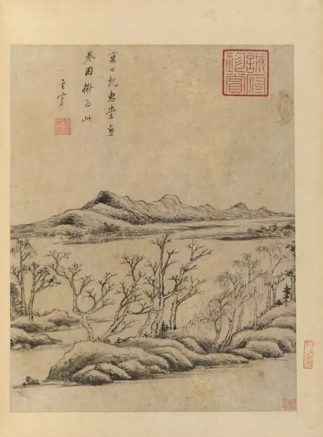 ▲(八)京口观惠崇画卷,因拟为此。玄宰。对题:云横峭壁水平铺,渡口人家日欲晡。却忆往年看粉本,始知名画有工夫。其昌。