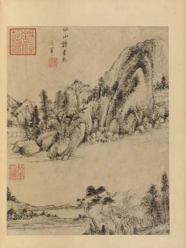 ▲(七)仙山读书图。玄宰。对题:绿溪青嶂是秦余,灵境今归藏史居。素友讵迷初得路,顽仙寂读未焚书。题画为武陵杨御侍。其昌。