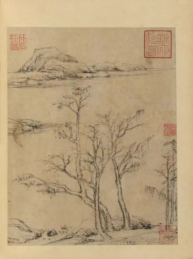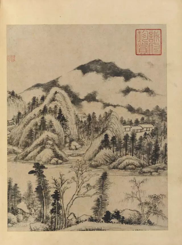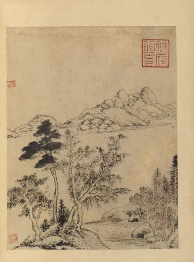 董其晶这十开山水小景,造境似云林,一江两岸,平林远岫,构图简炼而意境空阔;山石则以长披麻淡皴枯擦,松秀润淹;丛树多用率笔、复笔勾勒点染,极尽枯湿之变。淡墨轻岚,一派江南,情景宛然。