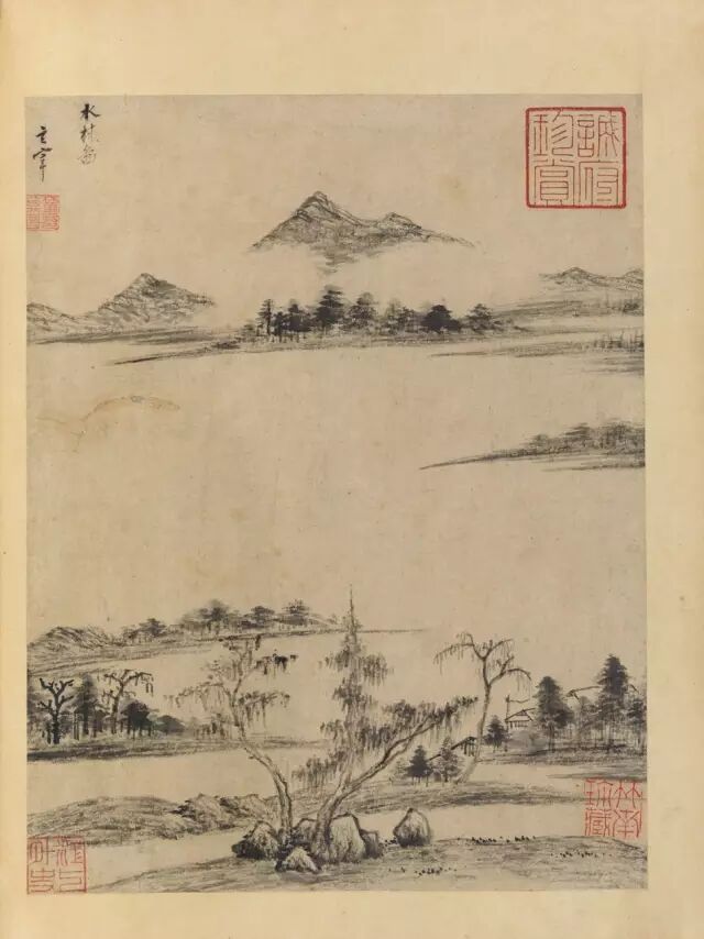 ▲(三)水村图。玄宰。对题:黄子久有沙碛图,赵吴兴有水村图。画谱所谓湖天空阔之景,非曾游三湘七泽者不能领略也。其昌。