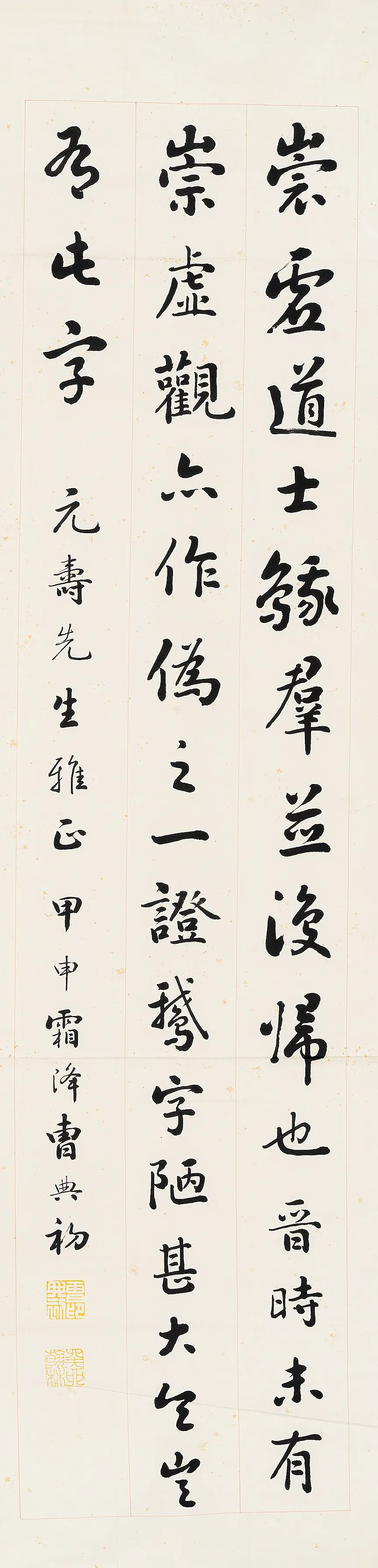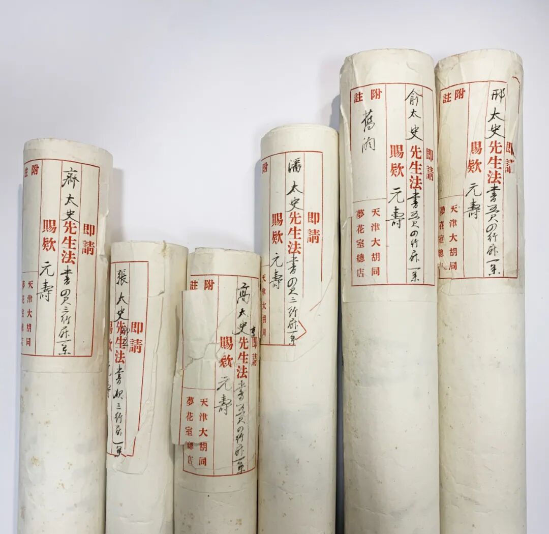 本组作品尺幅大小一致,均为约五尺或四尺作品,且均未托裱,原宣纸出品签章清晰可见,有统一格式的签头和标明纸张出处和品级,如“上上玉版宣”、“天津夢花室精制”等。据考,上款人为清末民国著名书法家邵元寿,曾为《淮安日报》题写报头。