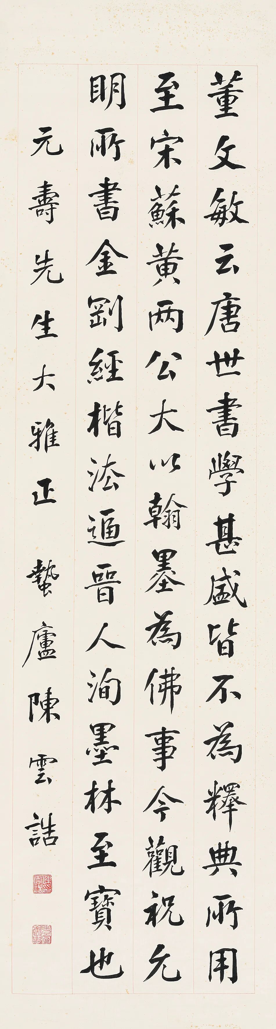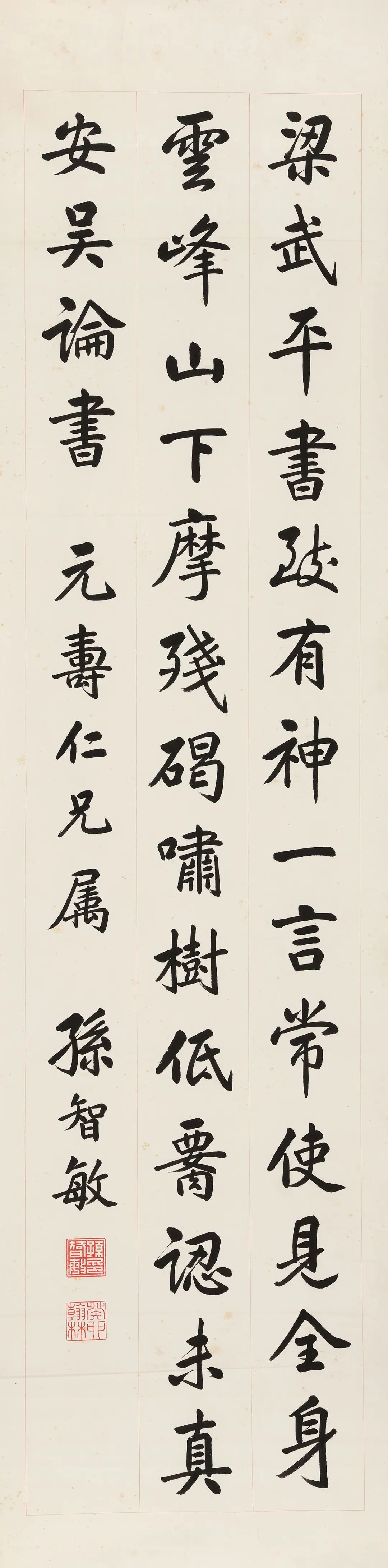 其中,重视贴学的有潘龄皋、曹典初、钱崇威、孙志敏等。潘氏书法自成一家,名重平津和冀中一带,曾与谭延闿齐名,时有“南谭北潘”之论。其“行楷七言诗”用笔简洁明快,结字舒朗匀平,取法颜真卿、苏轼的厚重丰腴,兼之以赵孟頫、董其昌的淑美清雅,得刘墉之意韵,尽显自家风貌。曹典初“行书《鹅群贴》辨伪”出自颜柳,气韵平和,拙中含姿。钱崇威“行书节录《谢安传》”,结体疏朗,清新秀逸,一洗馆阁之习。孙志敏“行书七言诗”书出锺、王,略参李邕,娟秀端庄。其他:陈云诰、邢端、文斌等家更是贴学痕迹明显,亦为同源也。