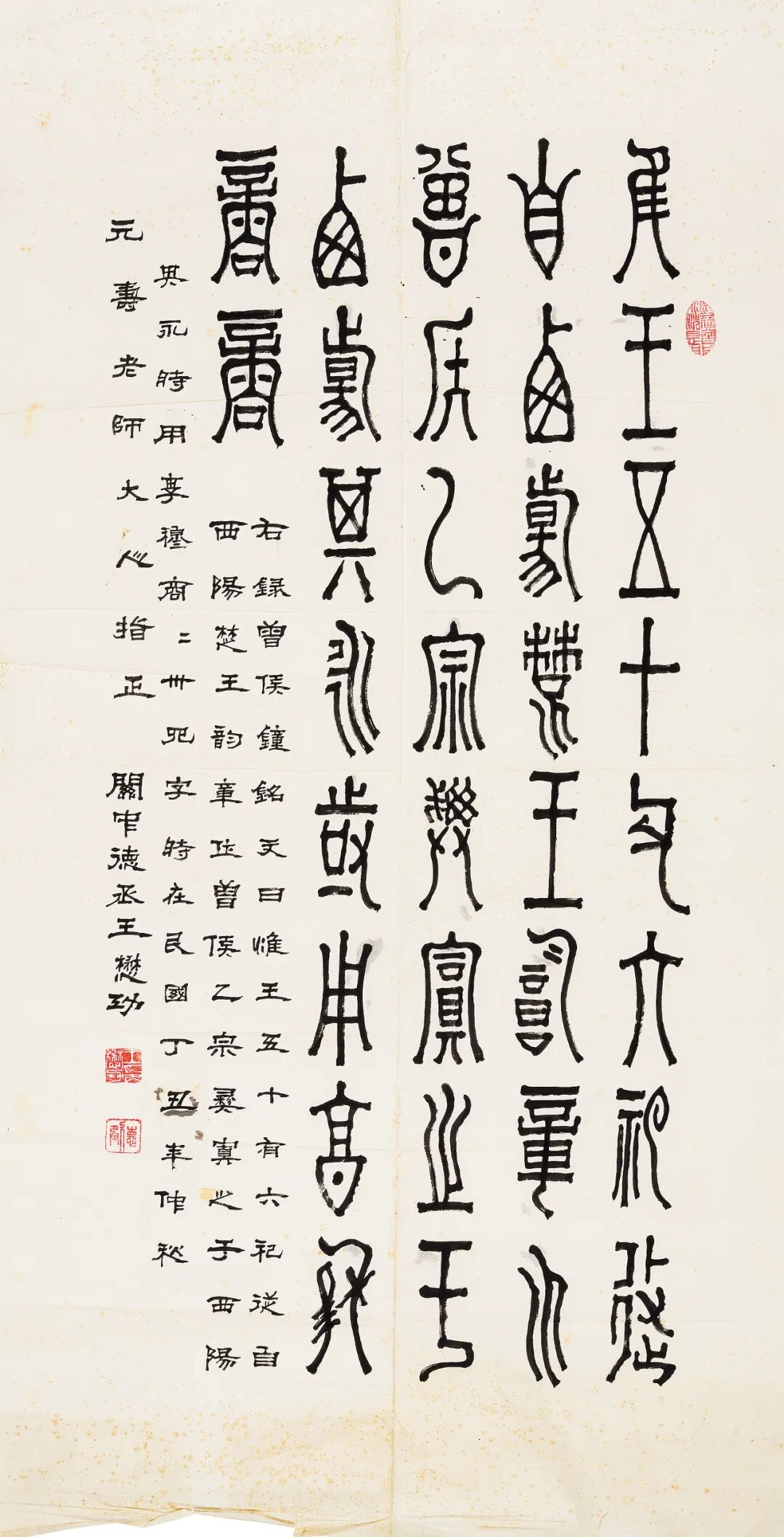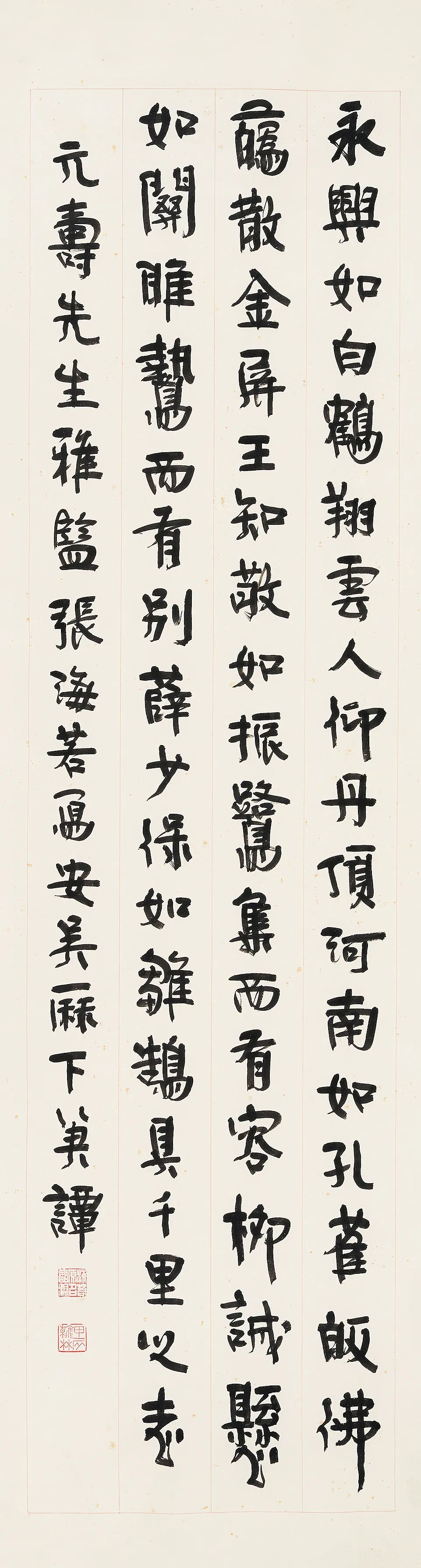 崇尚碑学的有张伯英、高振霄、张海若等。张伯英晚年犹醉心于书画金石,节操高尚清雅,与海内名家康有为、梁启超、于右任、张学良、齐白石等交往密切,且以精于品鉴金石书画闻名于京津。张氏“魏碑七言联”以北碑为宗,又植根汉魂而化以苏、黄,笔力凝重,结构紧敛而不拘谨,字体规整端正而有洒脱之致,用笔方圆兼备,宽博雄放,紧凑严密,应属晚年妙品。高振霄,常年临碑,至老不辍。其“行书八言联”、“行书节录王曾传”,用笔稳健,挺秀峭拔,顿挫奔放,虽俊朗生姿,但不失金石碑帖之厚重。张海若,书画篆刻精绝,并对金石深有研究。其“行书录包世臣评书法”用笔方折,结体茂密,整篇透露着碑帖的硬朗与厚重;王懋功更直接以临“金文录《曾侯钟铭文》”表达了自己对金石文字的态度。