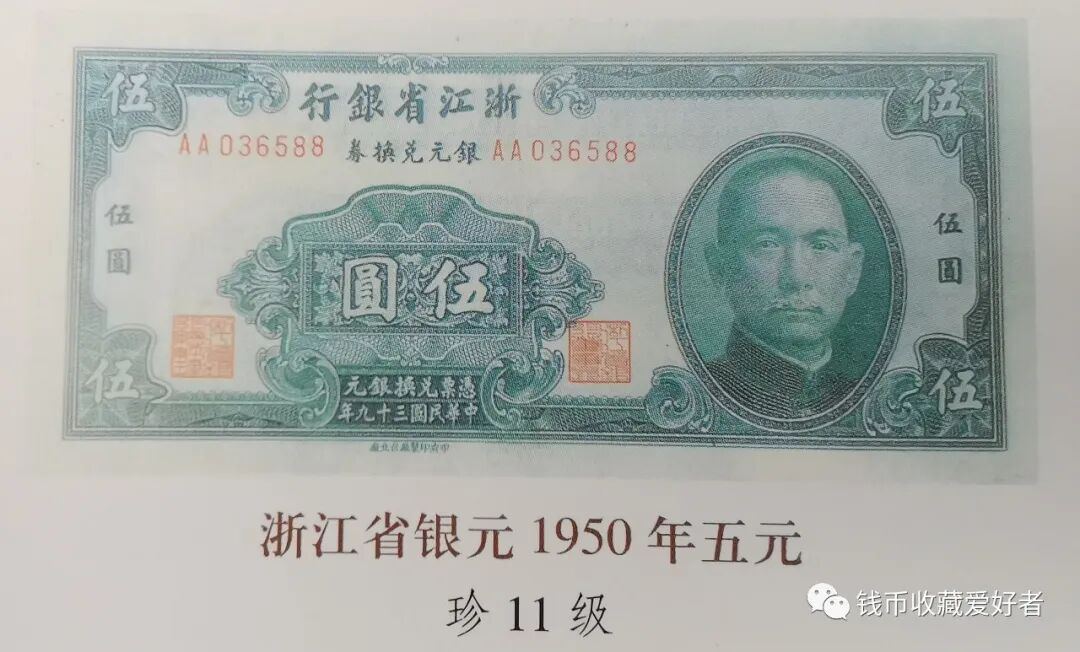 浙江地方银行于1945年改名为浙江省银行。1949年发行一组银元兑换券,计主币一元、五元,辅币一角、二角、五角,均有中央印制厂台北厂承印。背面为董事长和总经理的中文签字。除伍元券为1950年印制外,其余均在1949年印制。该组银元券流通时间极短,市面上除一元券相对易于搜集外,其他面额的纸币极为罕见。