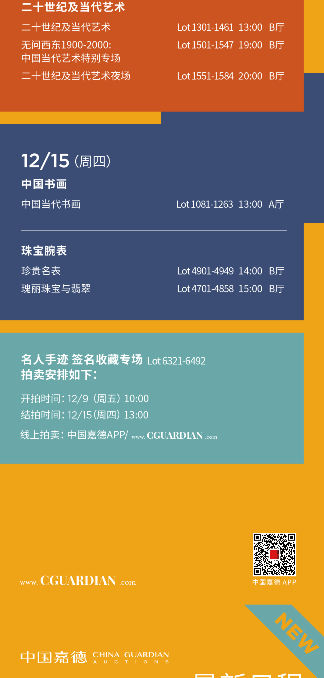 中国书画部分的近现代书画专场将举槌,人们耳熟能详的近现代艺术家的精品力作汇集一堂,等待着您的慧眼和好运。古籍善本的拍卖也将闪亮登场,“古籍善本 金石碑帖”、“笔墨文章——信札写本”两个专场甄选400余件拍品,名贤荟萃,佳椠云集,为好古藏家提供了丰富的选择。拍场精彩不断,艺术魅力无穷。中国嘉德祝各位藏家好运连绵,圆梦明天。![]()