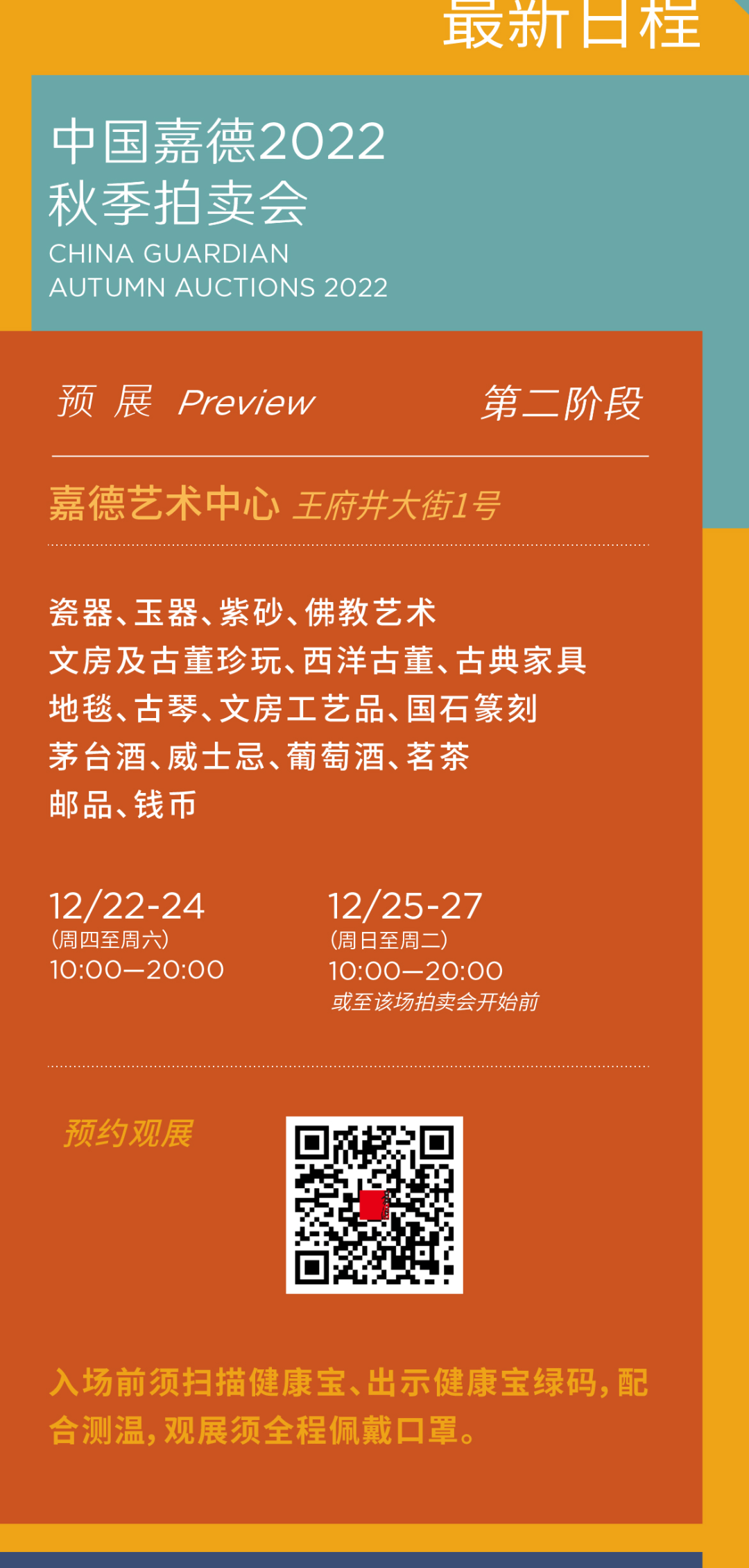 为方便您的参与,拍卖会共有现场、书面或电话委托、网络同步拍卖三种竞投方式供嘉宾选择,无论您身在何地,都能参与出价竞投。您还可以通过中国嘉德官网或中国嘉德APP观看全程直播,身临其境感受拍场时刻。