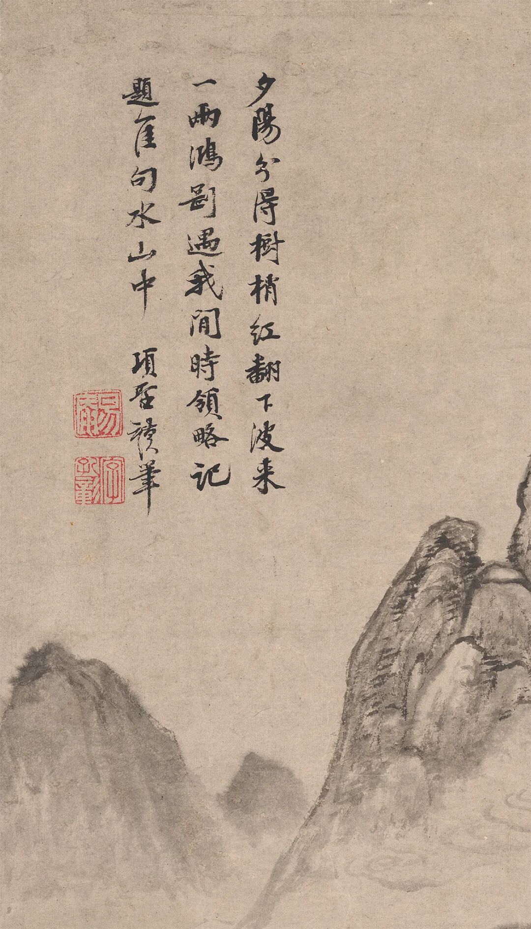 创作本幅时,项圣谟已步入晚年光景,深知复明无望的他心绪已逐渐平淡释然,高隐之志与旷逸之思重又回归其绘画母题,而盘桓郁结的黍离之悲与离乱心绪,此刻也如画中飞鸿一般,逐渐溶解于清明的山光水色之中。