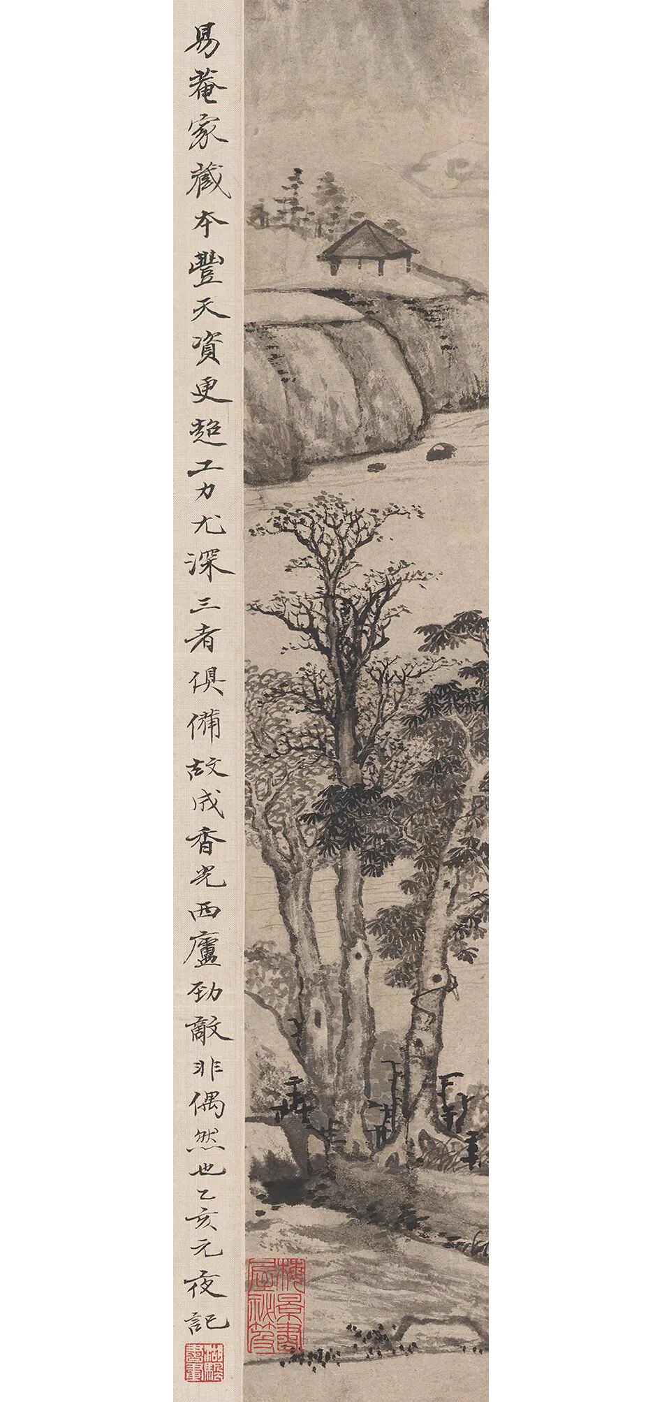 本幅未署年款,款识处所钤“易庵”白文印及“字孔彰”朱白印并见钤印于上博藏顺治戊子年(1648)至己丑年(1649)所作的十二开山水册页中。故推测本幅的创作时间应在1649年以后。