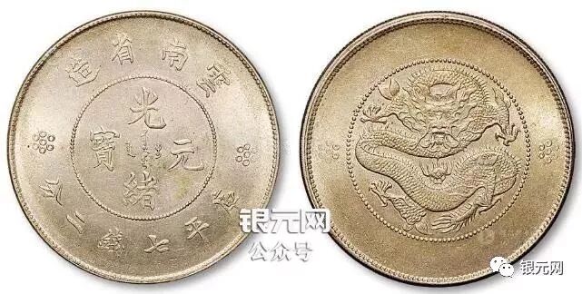 云南省造光绪元宝银元有两大类,最简单的辨识方法就是看背面有无英文。由光绪三十四年的关册中可知,最初发行的是“中铸龙样,边用英文”,此版银元在当地俗称“粗字满龙”或“粗字粗龙”。泉界习称“老云南”。与其他省份龙银相比,“老云南”图文较为深峻。