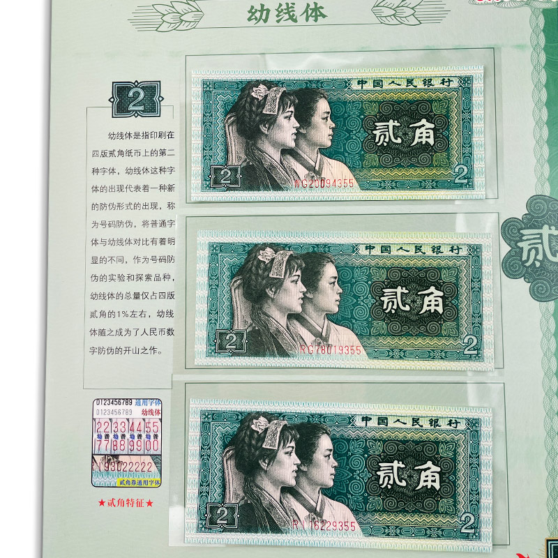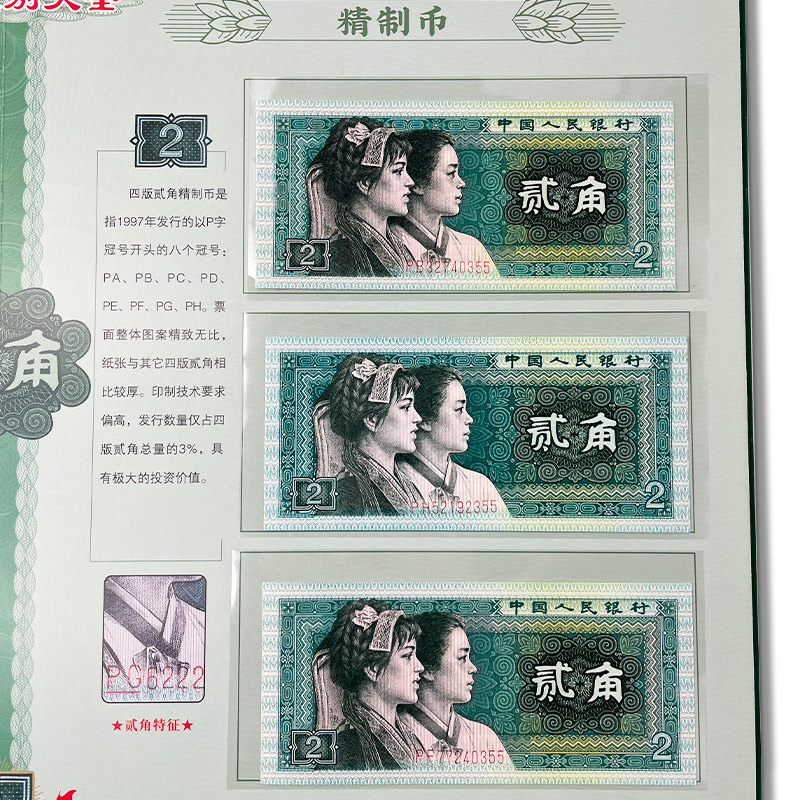 这本珍藏册共含30张80年2角纸币,一共有10个特殊版别,包括了少见的精制币、幼线体、I版(爱版)、首发C组冠、以及青绿美翠的荧光版等等。整套还是难得的尾三同号!而且,这张纸币是我国发行的最后一枚2角面值的纸币,绝版关门币,非常具有收藏价值!也正是因为难得、量少、收藏价值高等因素,这套册子之前的零售价高达3980元!