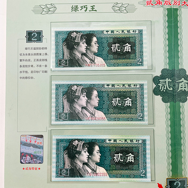 8002,我国在1988年发行的2角纸币,属于我国第四套人民币,是我国八九十年代重要的流通辅币,同时是四版币中最早开始只收不付的品种。而且,不同于四版币其他的面值,有的有好几个年份,80年2角只有80年这一个,四版币中唯一的2角纸币,大小全套配套都需用到,礼品消耗大,存世量少。另外,自四版币后,央行便不再发行2角币种。这张2角,是我国发行的最后一枚2角面值的纸币,也就是2角纸币的关门币!收藏意义和价值不言而喻。除此,这张2角,通体蓝绿色。有着收藏界“逢二必涨”、“逢绿必涨”两大规律的加持,收藏潜力十足!而今天小藏带来的这款珍藏册,还是特殊版的80年2角,更有收藏意义!非常值得入手收藏!