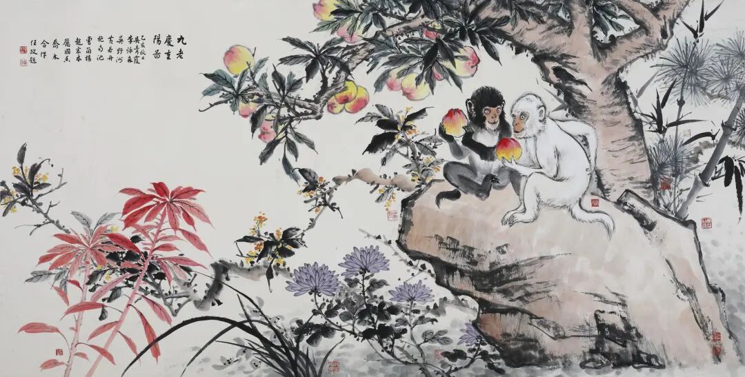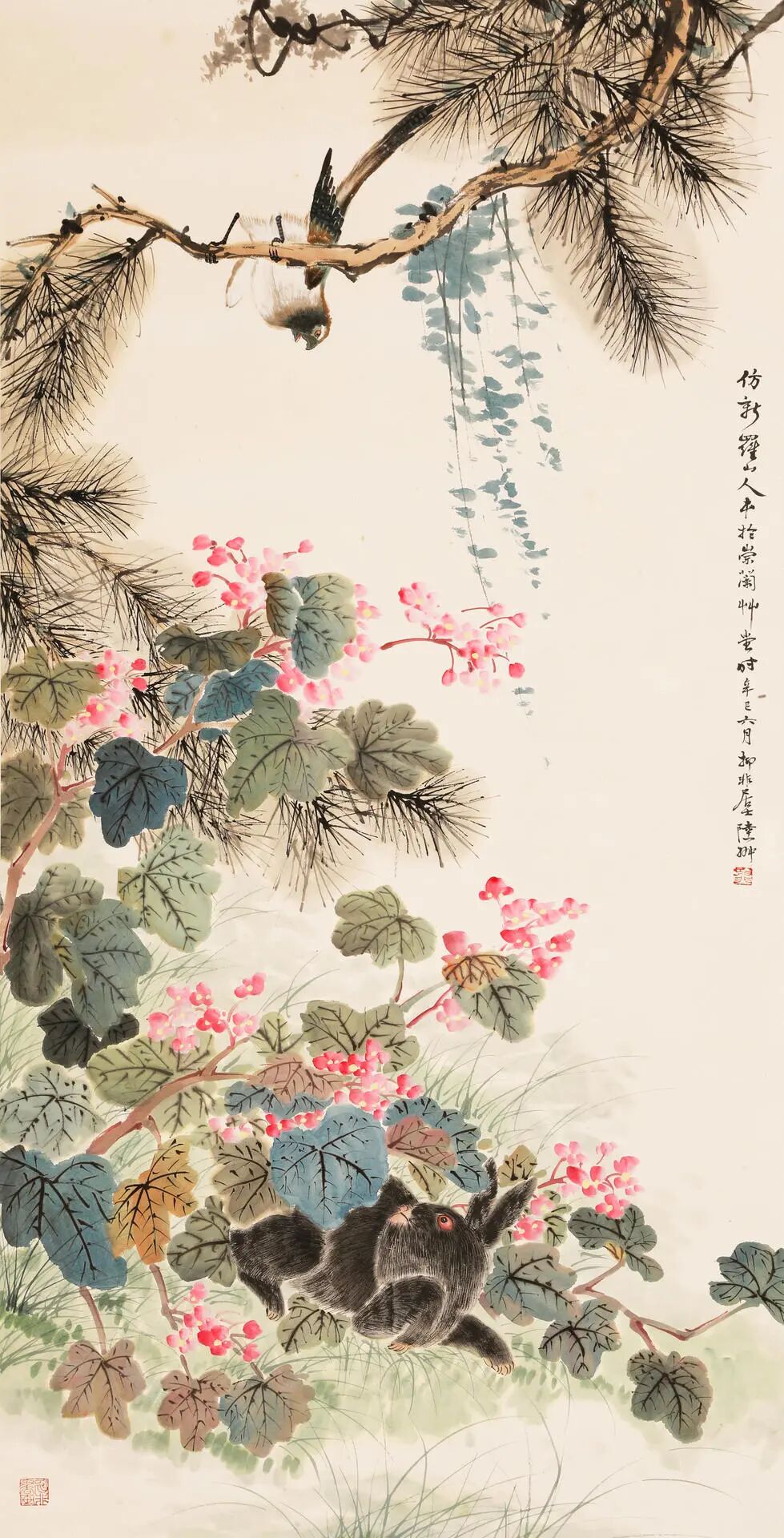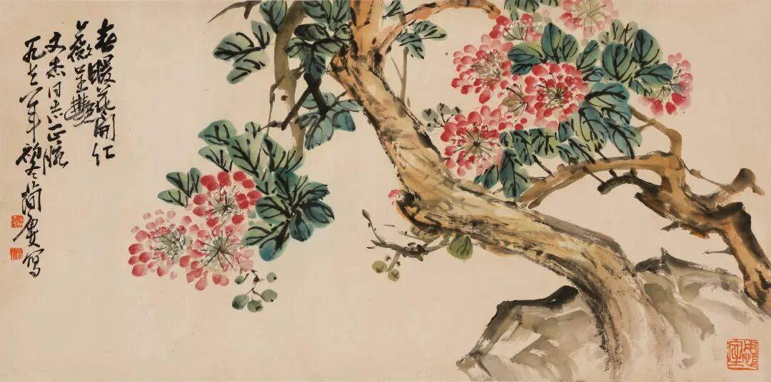 题识:乙亥秋日,吴青霞、李詠森...乔木合作,任政题。