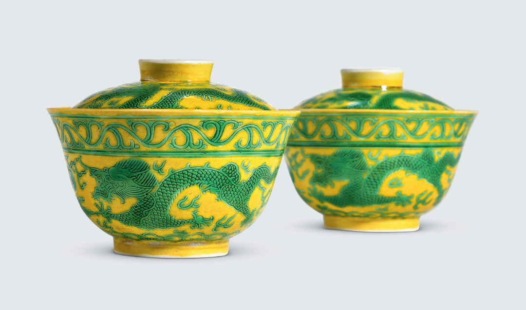 清光绪 黄地绿彩云龙纹盖碗一对