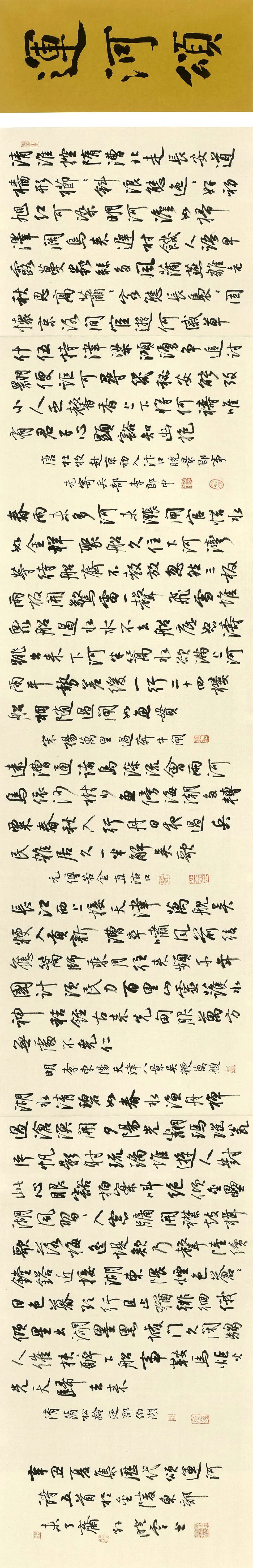 五首诗歌,五幕图景,孙晓云以俊逸饱满、端庄大气的行书字体书写成上述这幅《运河颂》手卷,拼接成千年运河不断生长流淌的壮美画卷。