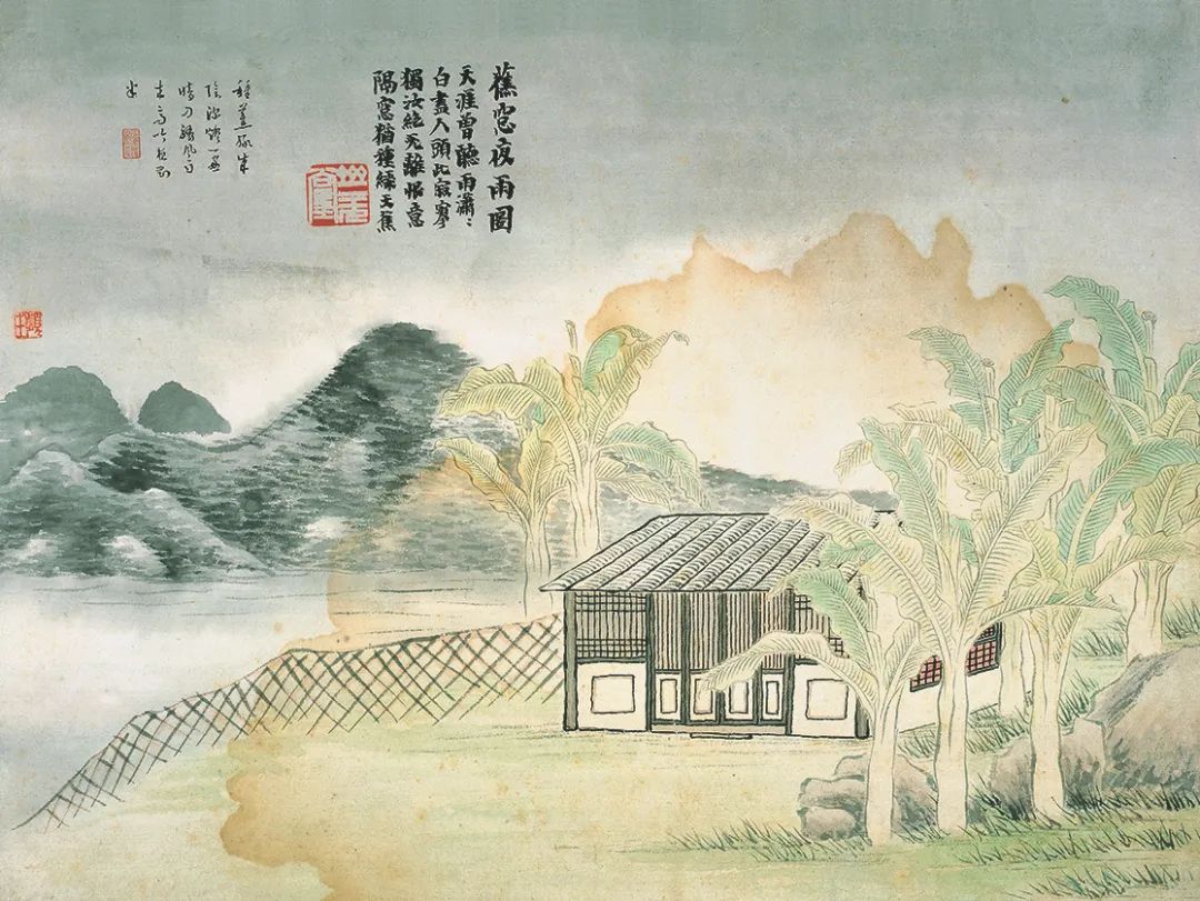 如前所述,山水画在中国艺术的传统里一直属于精英文化。齐白石早年在湘潭的时期,就是因为许多文人名士的影响,开始创作山水画。齐白石早期的山水画创作主要是靠临摹,未脱“四王”的影响。“五出五归”后白石老人所创作的《借山图》和《石门二十四景》则已经摆脱“四王”的风格,意境新奇,初步具备了齐白石山水画的风格。[24]《石门二十四景》此套册页在形象上虽仍带有早期临摹《芥子园画传》影子,[25]但也出现了许多“五出五归”前所未见的元素,举例来说,《蕉窗夜雨图》在结构、皴法、用色上都有米家山水、沈周(1427—1509)和金农(1687—1763)的影子。这与齐白石于“五出五归”期间,饱览郭葆生等收藏家所藏名家真迹有相当大的关系。