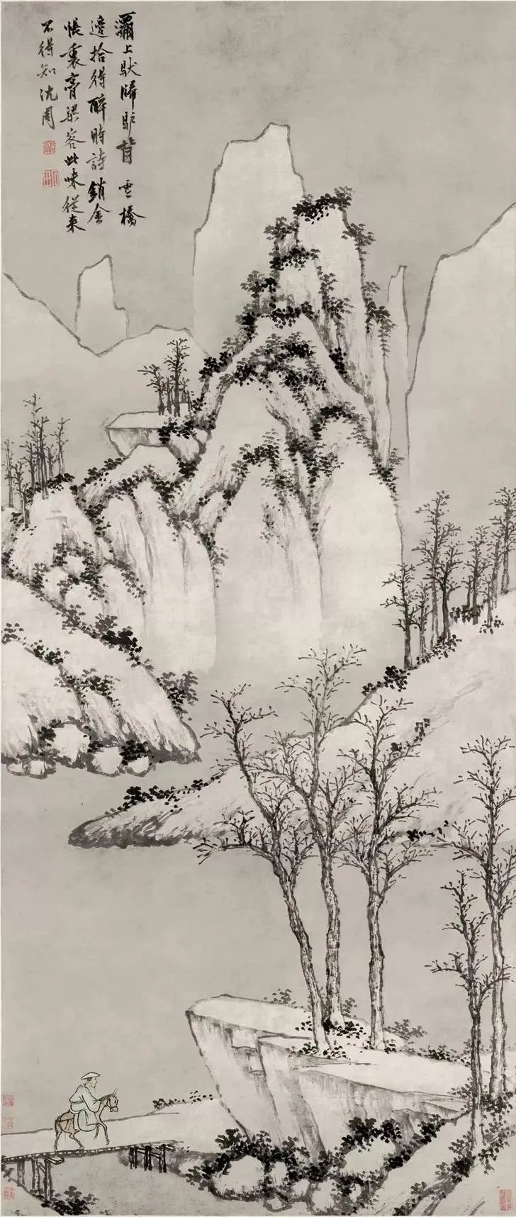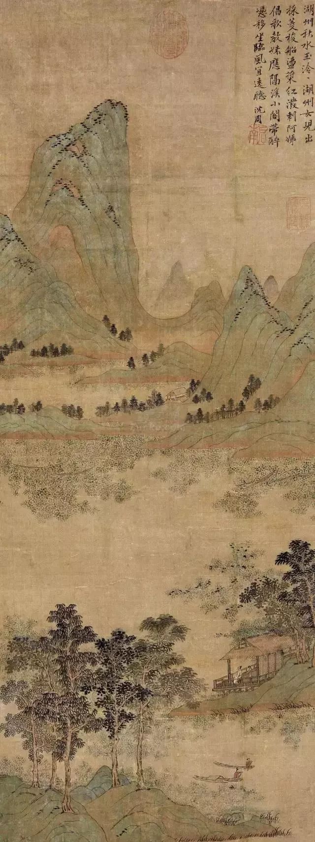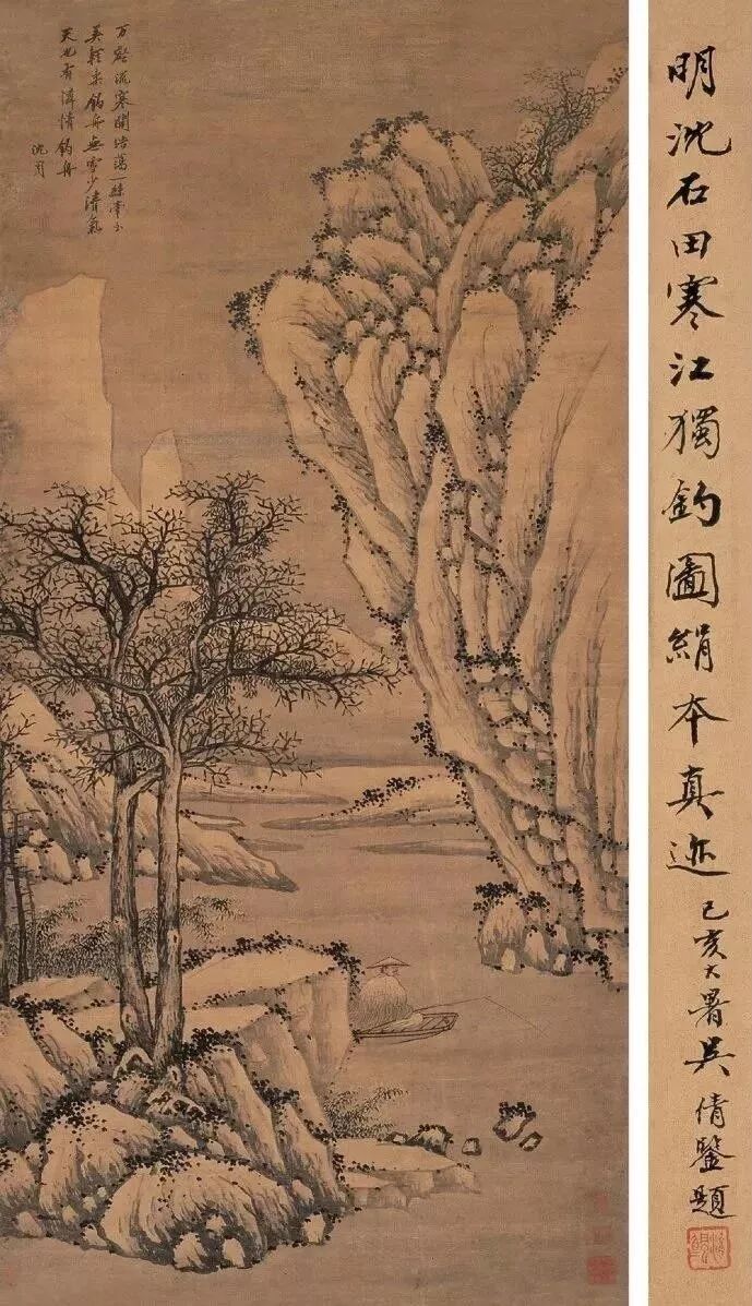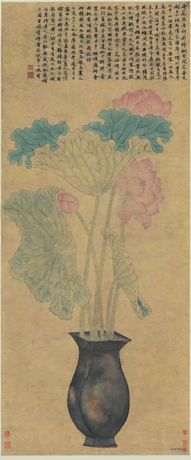 此图绘冬日江南风景,溪树山石,一翁泊舟独钓。风欲止,水无痕,景致宁静得几欲萧然,钓者俨然如张子和,斗笠蓑衣,悠然自得。这样的风景里垂钓,便是诗意,画於是有了文气……以构图笔墨看,董源、黄蒙兼而有之。沈石田才华不在科举中显名,而尽用於绘事,於此画可见一斑。沈周的山水画,有的是描写高山大川,表现传统山水画的三远之景。而大多数作品则是描写南方山水及园林景物,表现了当时文人生活的幽闲意趣。本幅《莲塘小隐图》绘江南小景,青山绿水,相映成辉。沈周的绘画融南入北,弘扬了文人画的传统。如沈周的粗笔山水,用笔融进了浙派的力感和硬度,丘壑增添了守人之骨和势,将南宋的苍茫浑厚与北宗之壮丽清润融为一体,其抒发的情感也由清寂冷逸而变为宏阔平和。他这种诗风与画格相结合,使所作之画,更具有诗情画意。庐山高图此幅画於成化丁亥(1467),取法为宋、元文人画传统,为先生41岁作,画祝乃师陈宽(号醒庵)70岁寿庆,故精力专注,特为杰出。画中山石林木笔法全仿王蒙,益以本身功力,更觉浑朴雄健。几无空处,山石融合了王蒙的解索皴与董源、巨然的披麻皴法,先以淡墨层层皴染,再施以浓墨逐层醒破。笔法稳健细谨,不恣意逞任,用墨浓淡相间,於满幅布局中有疏朗之感,故觉实中有虚。而画悬泉百丈直泻冲下,涧水轻柔,云光山色极为精采。关注公众号:古代艺术。“灞桥风雪”为古代长安八景之一,古代诗人多有描写。沈周此作即为依据古人诗意而作。图中描绘了平静的灞河水从远处山涧缓缓流来。河流近岸一坡脚平台上,几棵细瘦的寒树索然而立,枝叶在寒冷的空气中瑟瑟抖动。巨峰夹江,沟壑纵深,山石叠起,远峰耸立似屏。山上冬树瑟缩,冬苔遍植。整个山石白雪皑皑,茫茫苍苍。天色灰冷,江水凝碧,萧瑟冷寂。这件作品笔法温和秀雅,笔墨俭省,构景平和大方,是沈周的一件粗笔佳作。《瓶荷图轴》是一副工笔花鸟画,绘一铜壶,内植荷花荷叶各三株,交错而生。荷叶向背以深浅不同绿色区分,多取其背,使画面变浓艳为淡雅,凸现清高风格。作品形象写实,用笔简括,色泽温润,格调质朴。画的上方行书自题:荷花燕者,折荷插铜壶间,花叶交错止六柄而清芬益席,环列壶置席之中,四面举见花甚可乐客......花下睡鹅沈周兼长禽兽,此图画一老鹅,正栖于玉簪花下,鹅转颈埋首于背羽间,半闭其目,睡态蒙胧。毛羽作双钩,略加皴点,自头至腹一笔而下,时见脱落,却笔断而意不断,颇有宋人含蓄遣意。鹅顶及双蹼以朱黄染,背景则为一大湖石,峋岭突兀,挺拔高耸,玉簪一株,亭立石下,正叶以草绿染,背叶则略以白色醒出,叶脉也缓缓勾出,与信笔勾成的花朵,极见清趣。坡面向右方斜下,笔端略见飞白,深得转折起伏之妙,且使鹅身与山石相对立,与所题诗句对称,构图特别显得稳重安帖。意指王羲之笼鹅,喜鹅颈转折,从中得悟书法笔意,故文人自来爱鹅。沈周书法从黄庭坚来,此幅写来更为挺拔,约为八十三岁左右晚年作品。菊花文禽图作于正德已巳年中,沈周八十三岁,绘后数月即去世。画一羽衣未全之公鸡,方展肉翅,立于菊下,全神贯注于半空飞翔之双蝶。菊花四五朵,正面侧面都有,浓墨点正叶,淡墨作叶背,并以浓墨为叶筋。菊茎甚高,故立一竹使支持不倾。全图未用色彩,而墨彩焕然,观全图中浓淡墨分布的得宜,鸡目的注视,鸡足的伸展有力,虽因年老力衰,未必如早年精到,但信手写来,无不见其规矩,诚炉火纯青之作品。