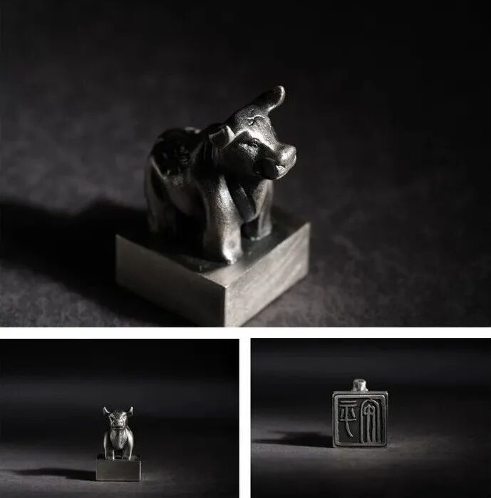 印章中的牛体格壮实,神态沉稳,浑身散发出奋力向前、坚韧不拔的牛劲。印面铸有“平安”二字,寓意平安吉祥、牛气冲天。