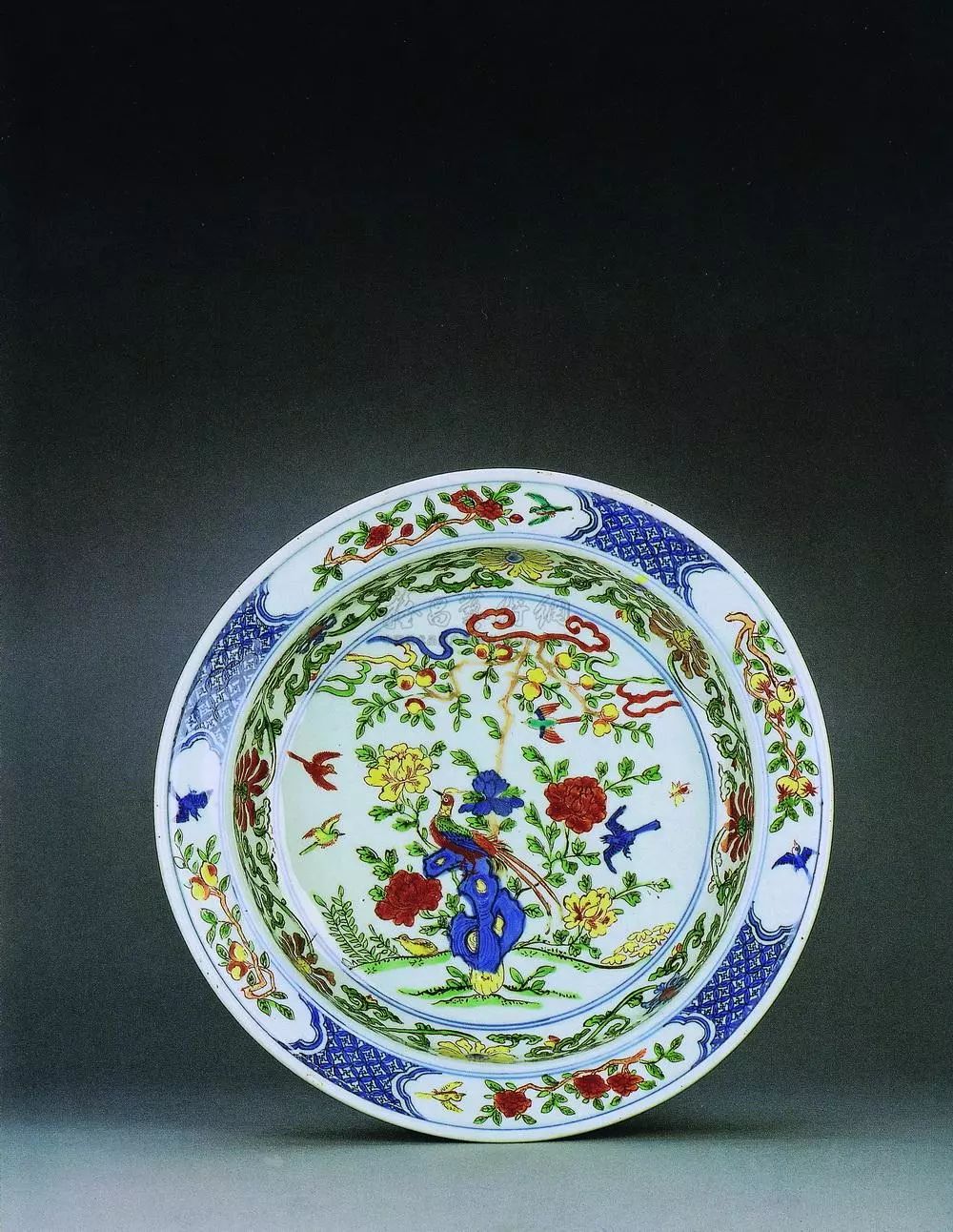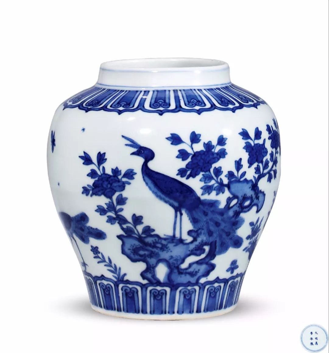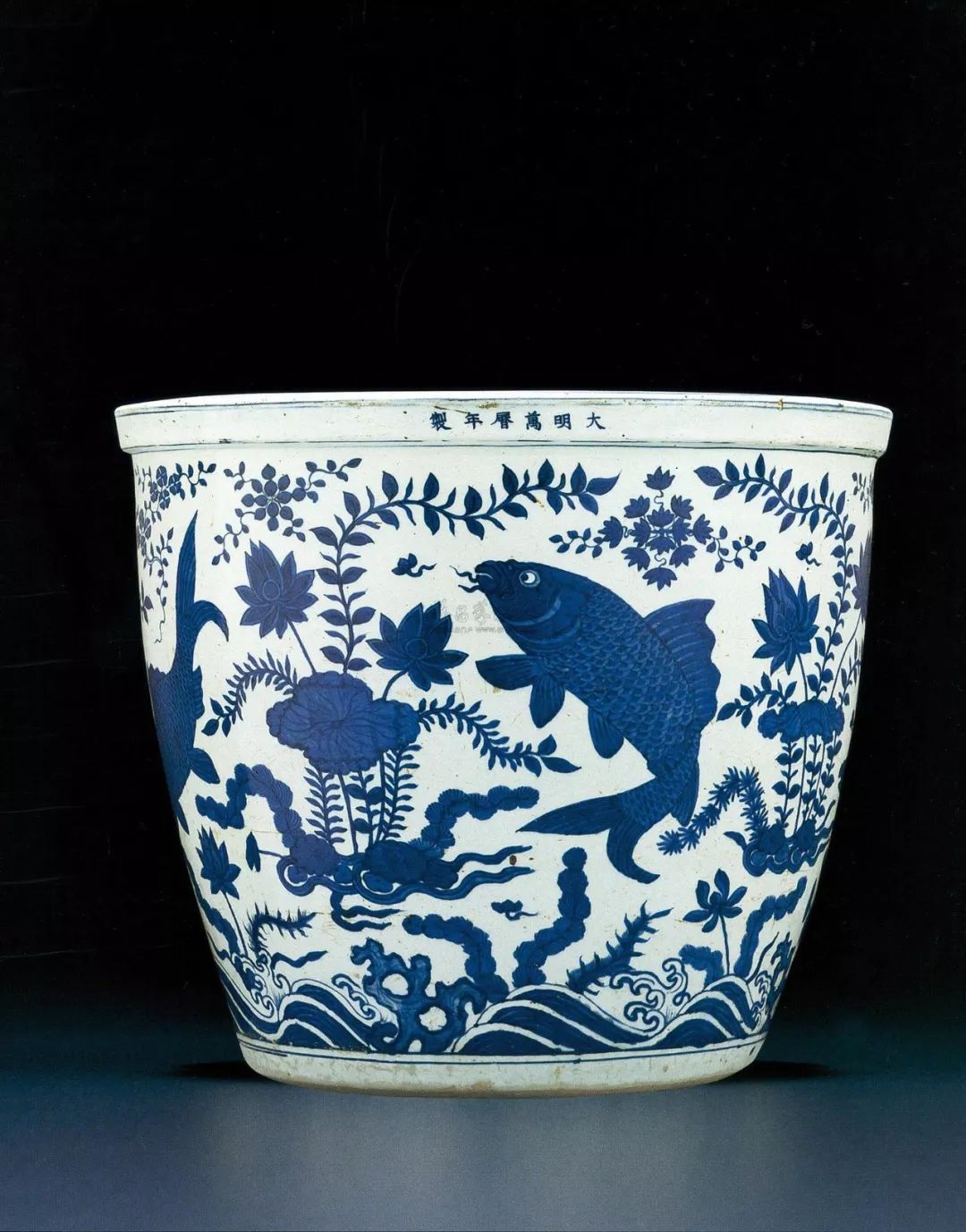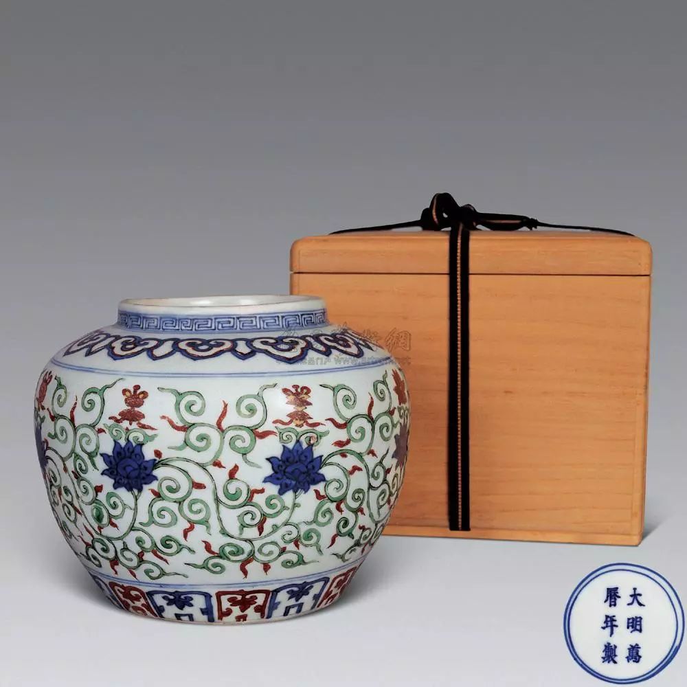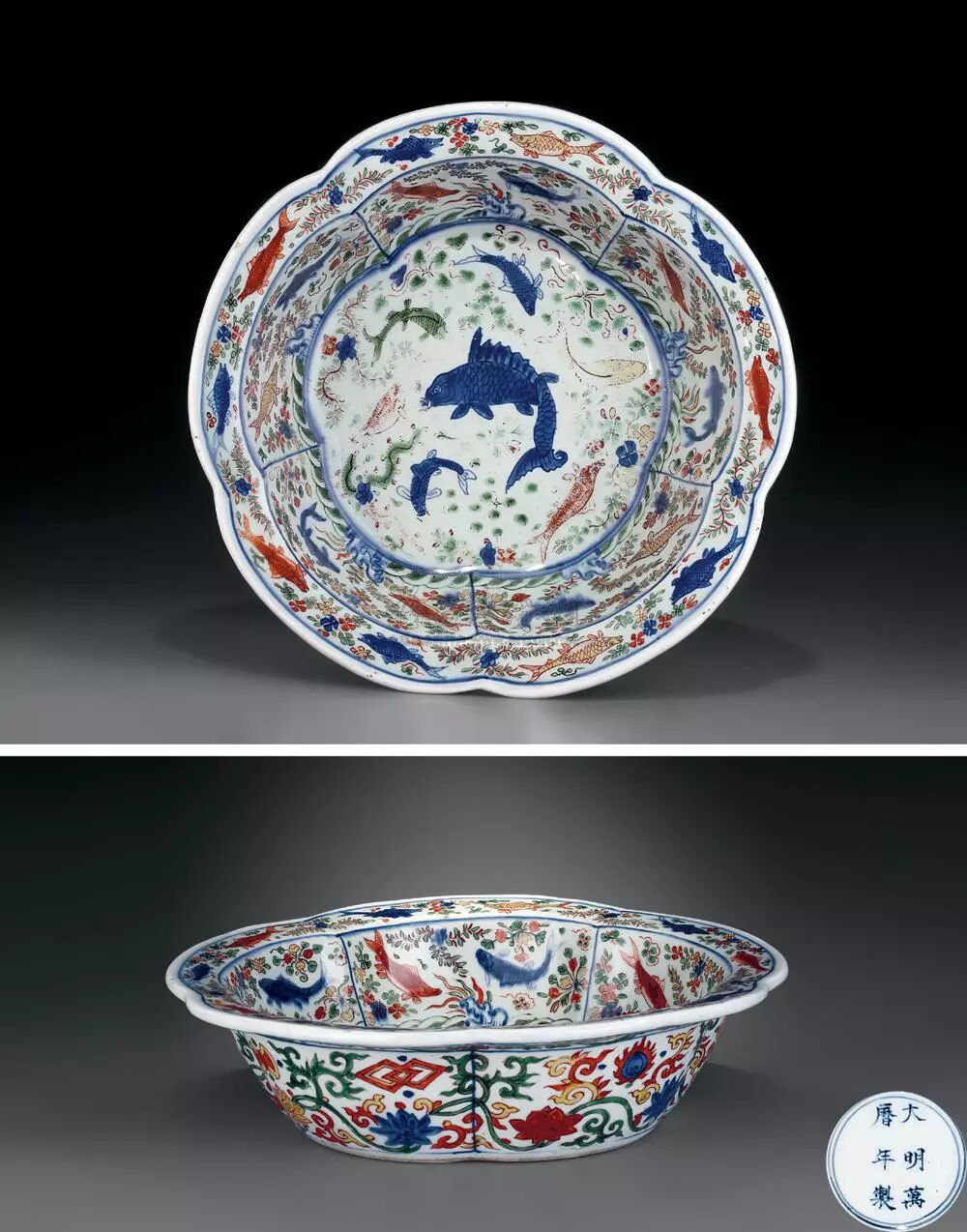 此式青花五彩龙纹出戟尊当为其中杰出之代表,造型源于上古青铜器,朴拙古雅。整器呈花觚型,于颈部、腹部、底部两侧突起出戟装饰,口沿内外壁均绘五彩花卉纹,颇为特殊;颈部与腹部四面皆绘以五彩寿山福海腾龙纹,蛟龙姿势各异,升降交错,诸彩搭配之下倍觉威猛有神。底部圈足,内心以青花书“大明万历年制”款本品器型基本周正,无明显变形之虞,是为万历官窑不可多得之佳作。 另外,此造型的设计与纹饰的布局构图关系密切,例如本品在造型上分出六部分,设计者正是借助造型的变化为繁复的纹饰提供有效的过渡,每一部分均独立成图,彼此又相互呼应,从而达到纹饰虽然繁复致密,但整体构图层次清晰的效果。而造型新奇别致,装饰妍丽繁缛,造型层次丰富,集彩绘、模印、堆塑、浮雕诸项技法于一身,相互辉映,各见其妙,其装饰风格为万历一朝御瓷之罕见,当为万历御瓷花方尊之翘楚。市场流通中本类作品极为罕见,可查近似例极罕;市场流通中可见矾红地青花绘缠枝花卉之例,与青花绘花卉例若干,唯五彩出戟尊例不见。 瓶为半个葫芦形,以凤纹为主题。上腹绘双凤纹,穿梭于如意云纹之中,下腹绘凤鸟立于地面,置身于牡丹花丛及洞石之间,及三只小鸟飞动于空中。口沿与腰部分别绘蕉叶纹及如意云头纹,圈足饰卷草纹一周。背面颈部青花双长方框内青「大明万历年制」款,上覆荷叶,下承莲花。 此罐直口,椭圆形深腹,至底渐敛,圈足。通体满施白釉,釉汁肥腴温润。腹壁以青花为饰,肩部及胫部环饰一周变形蕉叶纹,形成上下呼应之势。中部主体纹样由两组姿态各异之孔雀组成,一只立于洞石牡丹之侧,一只回首顾盼,身姿袅娜,颇富神韵,其间点缀花蝶蜜蜂,皆各具情态,一派欣欣向荣之景。其青花描绘精细而生动,笔韵浓淡相间,层次丰富,尤以翎羽之绘饰写实传神。底心青花双圈内书「大明万历年制」六字双行楷书款。 孔雀作为瓷器纹样元代即已出现,而明承元制,瓷器纹样亦有延袭。大英博物馆藏一民窑嘉靖年间孔雀罐,大小及装饰纹样与本品相类,但整体做工与本品不可同日而语,仍可兹参照为时代之延烧。整器造型小巧雅致,构图布局疏朗,釉质甜润匀净,青花浓妍泛紫,描绘精细而不失工致,实为万历青花官窑不可多得之佳作。 杯撇口,弧腹,足靶起竹节式凸棱。外壁青花地留白纹饰,饰九只不同海兽浮游于海水中。高足饰海水纹,足节凸花如意纹。盌心饰八梵文围绕中间梵文。底青花双圈内书「大明万历年制」楷书款。如此器的万历款高足杯未见其他例子的着录。此款器源自宣德原型,台北故宫博物院收藏一件宣德款青花地白波涛海兽纹凸节高足杯。 盆胎体厚重,釉质光润,折沿花口,弧腹,平底。底部无釉一圈,底心内凹,书青花“大明万历年制”双圈双行六字款。此盆状若梅花,六瓣绽开,在明代宫廷档案原名称之为“梅盆”。外壁绘缠枝莲纹,内壁彩绘“满地娇”图。盆内壁及盘心均五彩绘姿态、颜色各异之鱼,水草浮萍漂浮摇曳,游鱼相互追逐,悠然自得,尤其盘心一尾青花大鲤由水中一跃而出,富具动感。 此器五彩彩绘华丽繁复,红绿二彩浓研相应,青花明丽泛紫,构图古拙之气尚存未脱,颇具意趣,深有万历年间五彩此器之风貌。万历五彩素负盛名,以红绿二彩炽烈取胜,《陶雅》云“万历五彩,草昧初开,往往显其拙相……皆非寻常匠手所能企及。”本品当为代表。 罐唇口,短颈,丰肩,腹下渐敛。外腹以青花留白技法绘百鹤祥云图,多数仙鹤昂首展翅朝左上飞翔,少数回首顾盼。底涩胎,中心内凹白釉,青花双圈内书「大明万历年制」楷书款。嘉靖、万历二朝崇尚黄老之道,鹤因寓有福寿之意,故成为当时最盛行的纹饰之一。 本罐线条饱满,敦实可爱,通体纹饰以釉下青花结合釉上五彩绘就。腹部主体分绘二图,一侧为相会图,庭院之中,主宾对坐交谈相欢,身边各立随仆;另一侧为课教图,芳园之中,塾师端坐讲授,学童伏案疾书,另有二仆托物侍立。整器所绘人物形神俱佳,笔法古拙,稚气未脱,颇具意趣。画面设色华丽炽烈,红绿二彩浓妍相映,青花幽丽匀净,黄彩璀璨夺目,其用色之巧妙,已至出神入化之境,深得万历五彩之精髓。 有明一代,佛教深入社会政治生活,反映在宫廷用瓷方面则是大量装饰着藏传佛教色彩的器皿自永乐朝起被烧造,如僧帽壶、梵文高足杯等,此莲花形盘即其中之一。莲花于佛教教义中象征“出于浊世,无所污染”,此盘拟取莲花为形,设计精巧,口内莲瓣的凹面有双勾垂云纹。盘心环饰两圈如意云纹,间以弦线相隔,中心书梵文。外壁上层莲瓣内画八朵折枝花卉,间以八个梵文相隔。下层莲瓣尖部画出叶脉纹,根部留白,显出莲瓣绽放之态。其釉厚润如玉,青花发色明艳,底部青花双圈内楷书“大明万历年制”官窑款识。其功用当为佛前供器,在密宗的理念中,该器所书的梵文为种子字,以草木的种子比喻佛、菩萨形象,写有梵文经咒和种子字的器皿是具有一种加持力,能得到佛法的保佑,加速修炼佛法的进程,此盘当为万历宫廷崇信佛教的一例佳作,国内外重要博物馆均有类似器物收藏,可作参照。 此器是迎合万历皇帝增寿的意愿而烧造的大器,缠枝莲托“寿”字组成“百寿图”,甚为别致。万历时期的青花百寿纹大罐沿袭了明嘉靖朝同类品种的装饰纹样,可参见《故宫博物院藏文物珍品大系—青花釉里红》中,页115,图105。但将开光内篆书寿字改为团寿